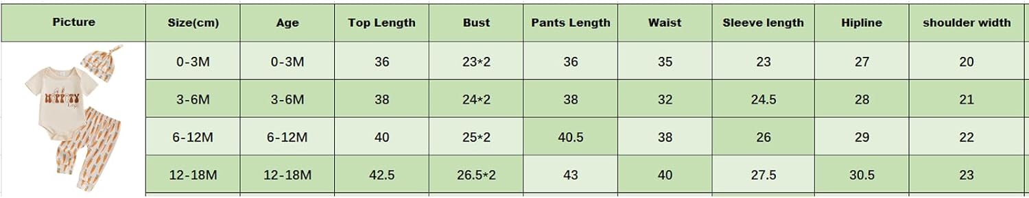 0-3M Tops Length: 36 Bust: 46 Sleeve: 23 Shoulder: 20 Pants Length: 36 Waist: 35 Hip: 54 Advised Age: 0-3 Months