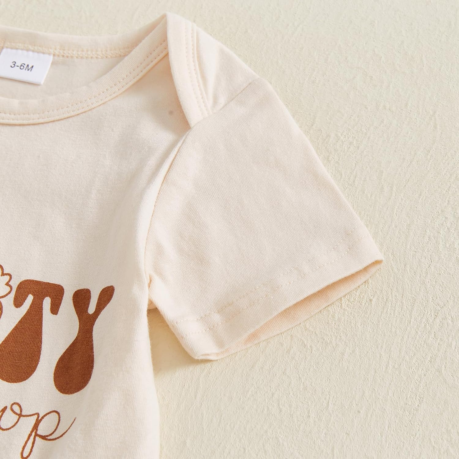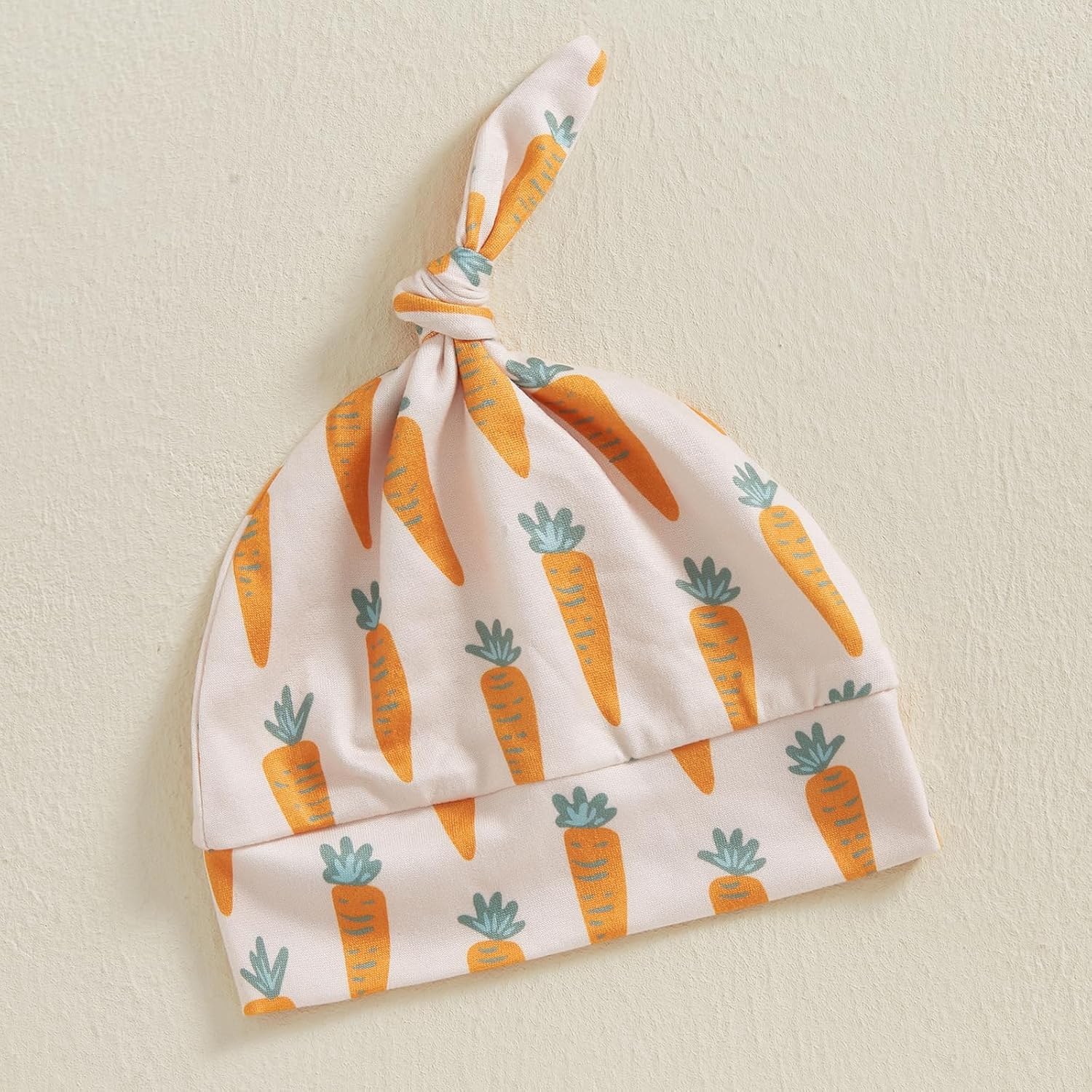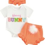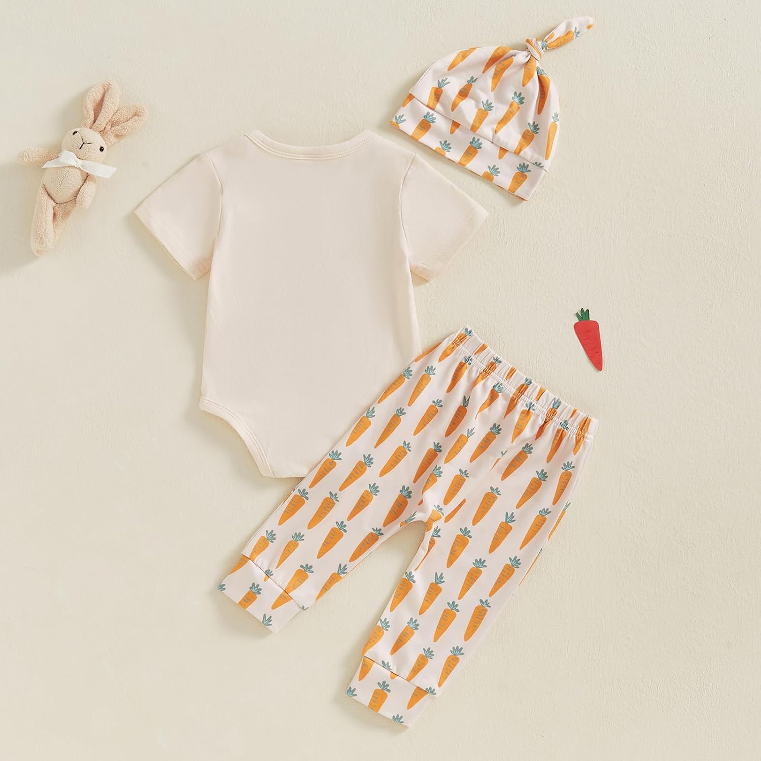 Vioyavo Baby Boy Girl Easter Outfit Newborn Clothes Letter Bunny Short Sleeve Romper Carrot Pants Knotted Hat 3 Piece Set