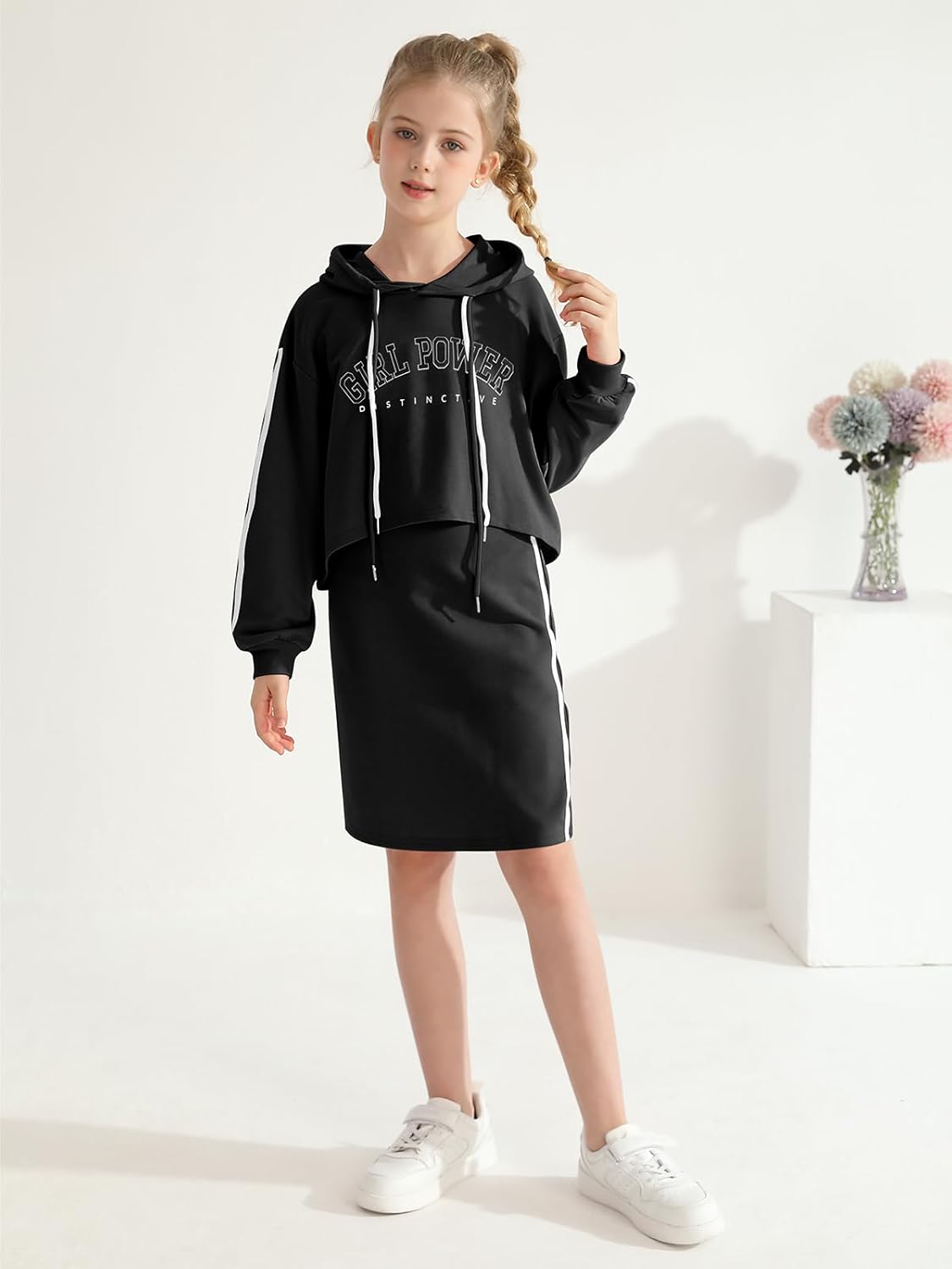 ESHOO Girls 2 Piece Outfits Kids Hooded Pullover Sweatshirt Tops Cami Dress Clothing Set Teen Girls Bodycon Dress and Hoodie Crop Top Sweatshirt Fall Winter Clothes