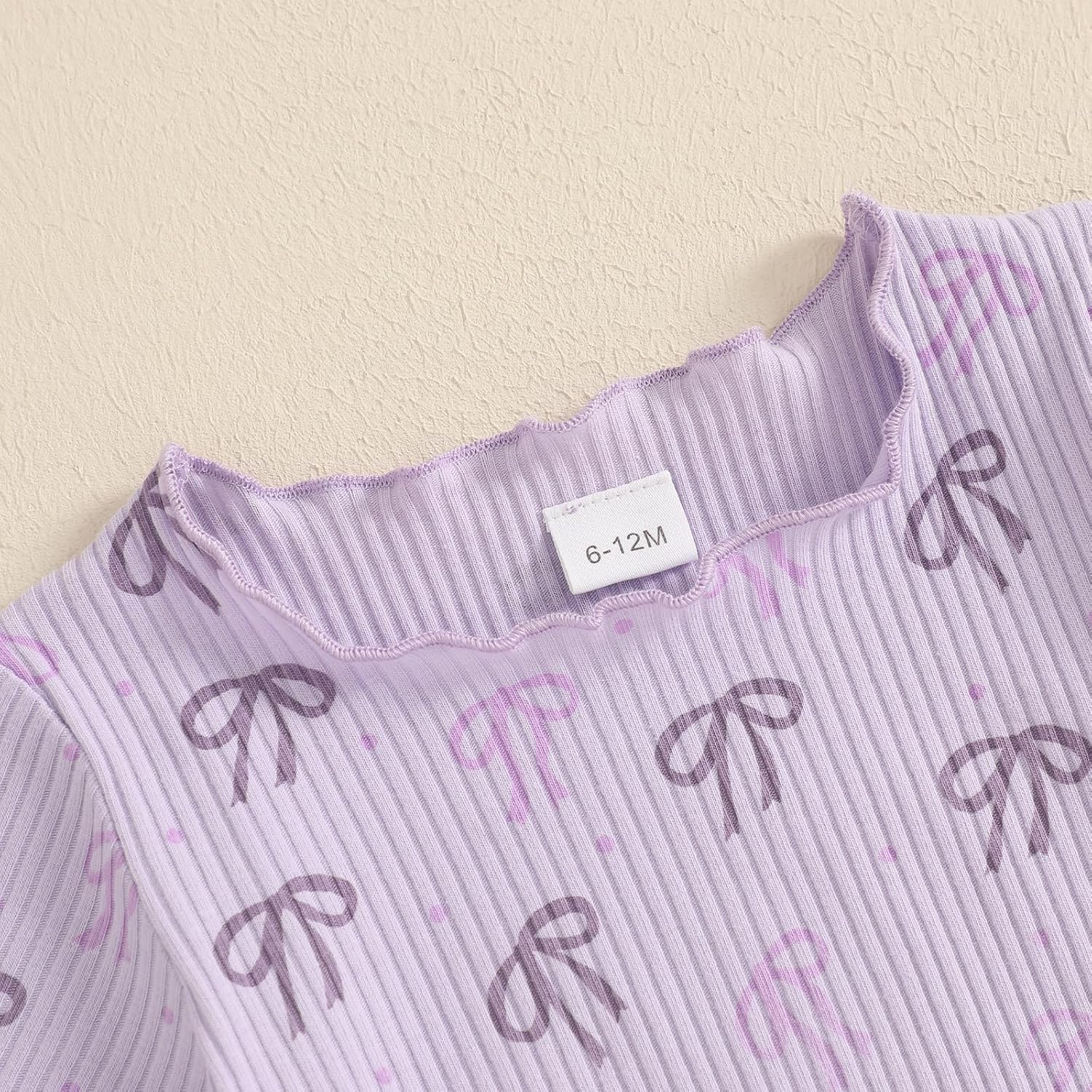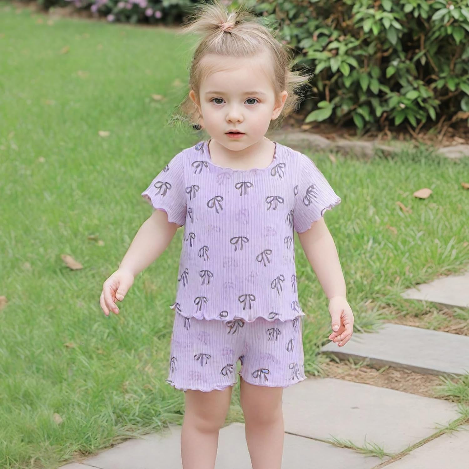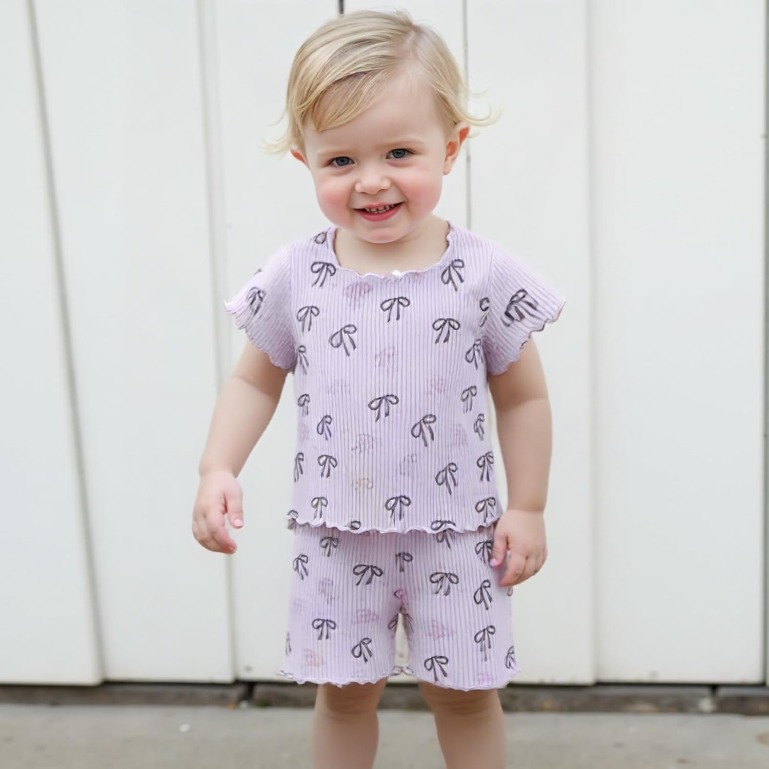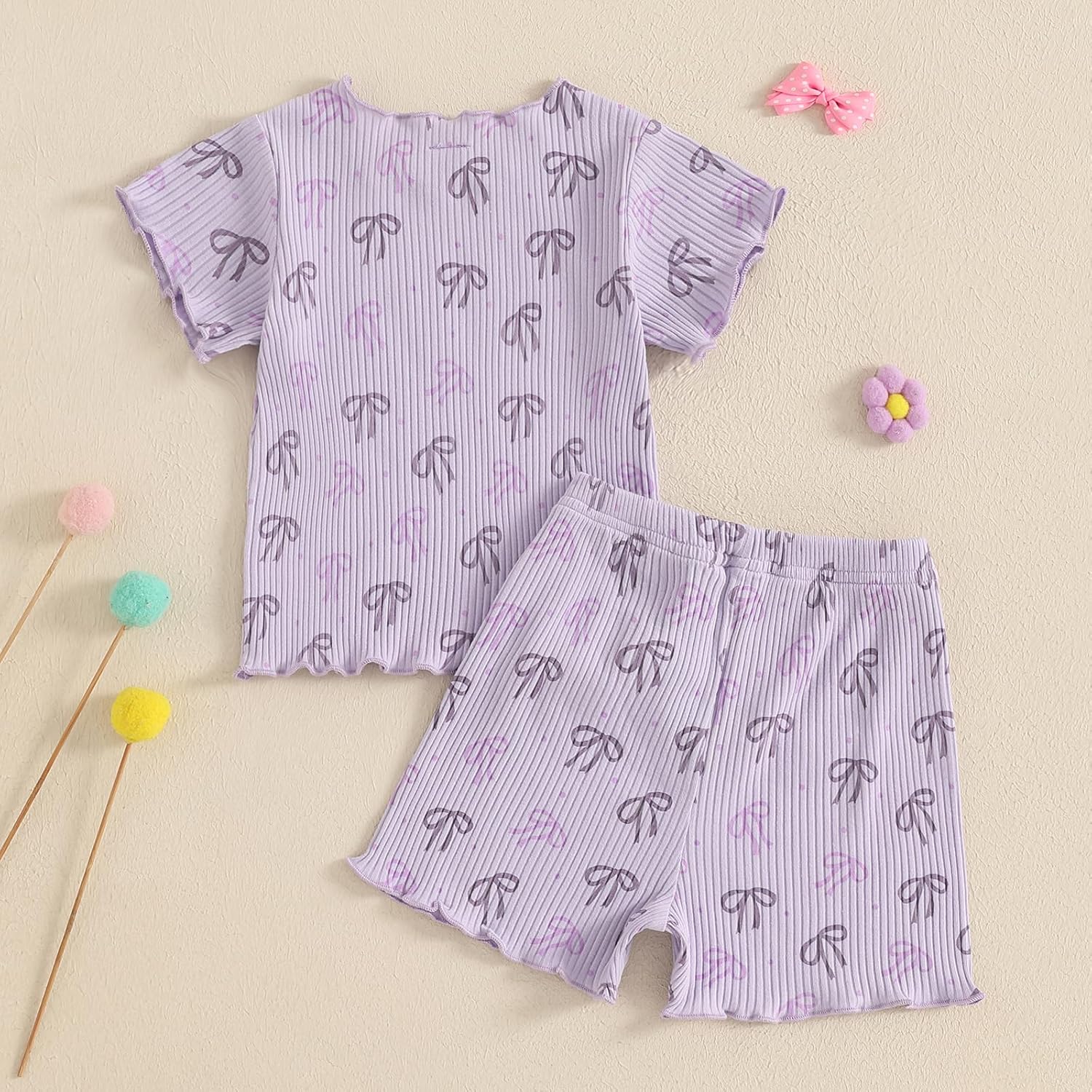 Geagodelia Kid Little Girl Summer Outfit Short Sleeve Bow Print Tops Pullover Elastic Ribbed Shorts Tracksuit Clothes 2Pcs Set