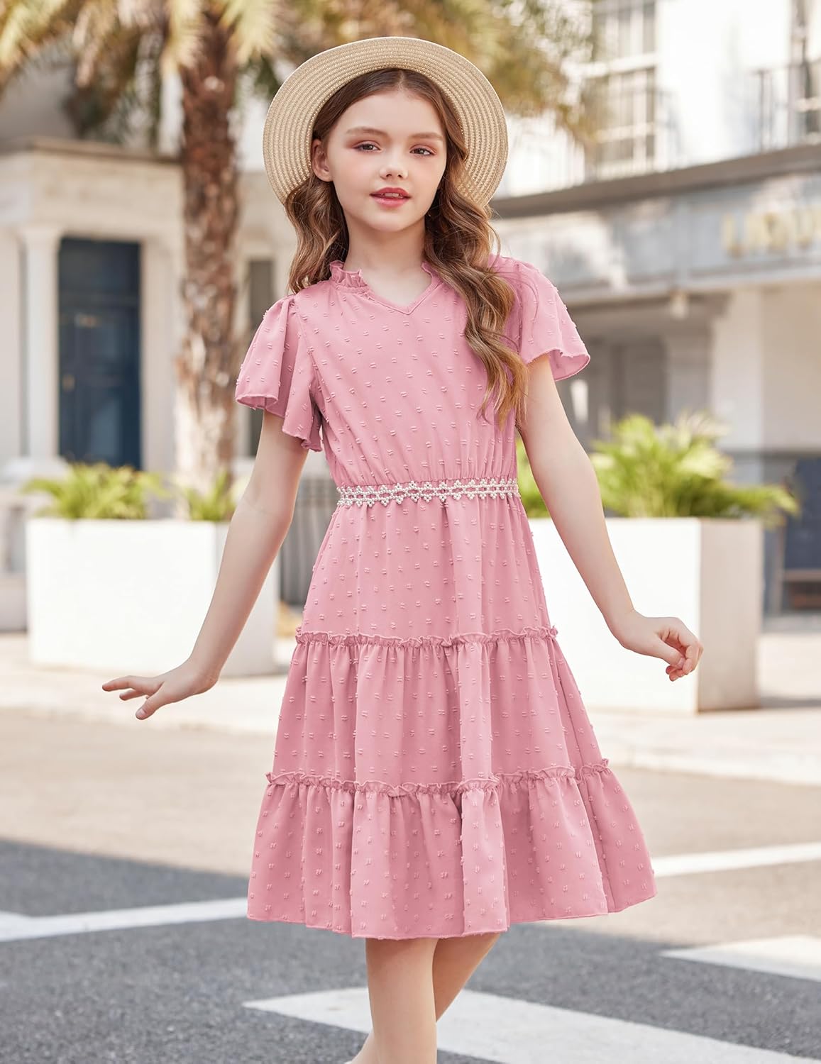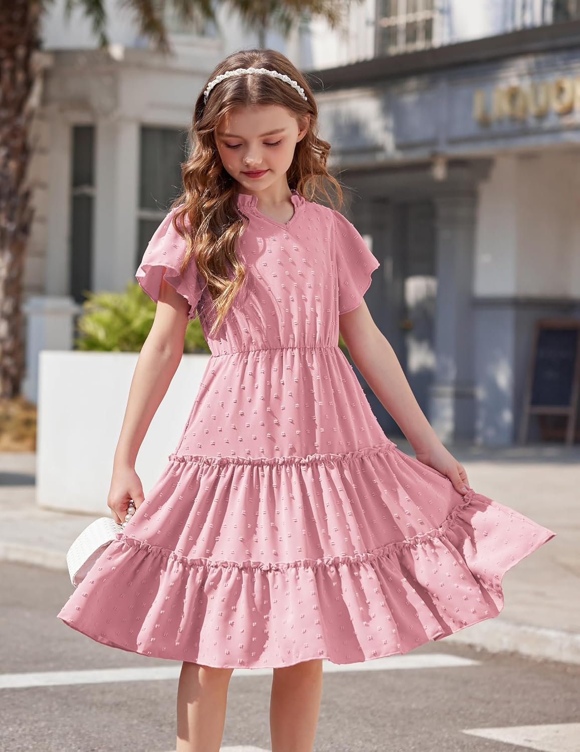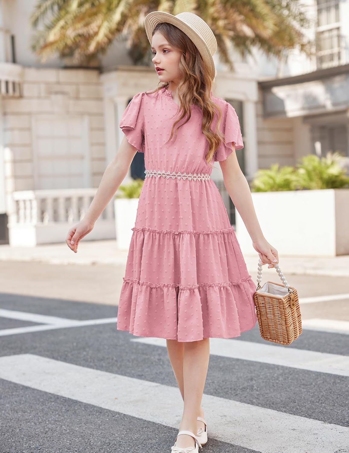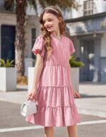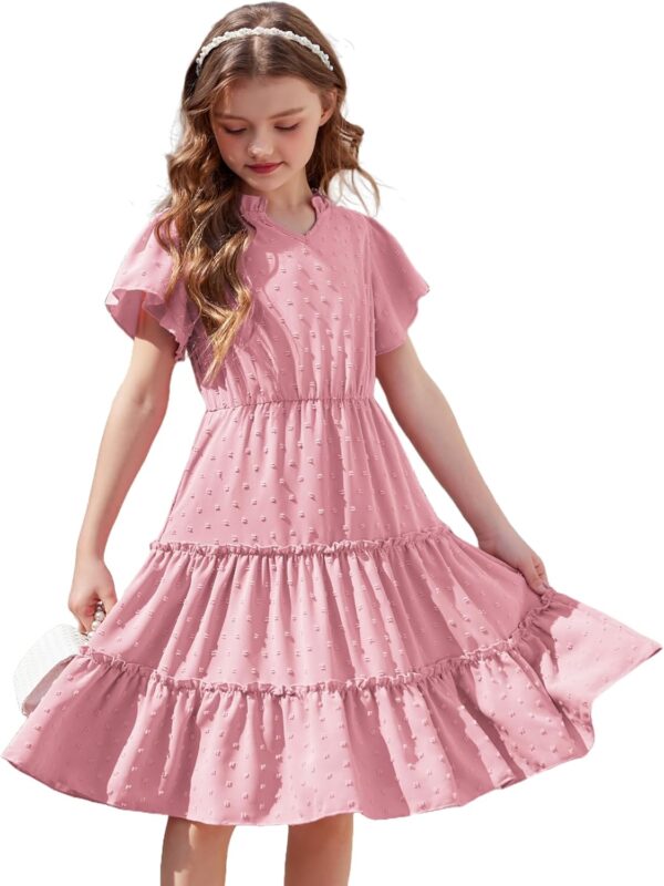 Girls’ Dresses Summer Short Sleeve Dress Swing Dot Party Dress V-Neck Chiffon Dress A-Line Beach Dress Wedding Festive Elegant Dress with Pocket