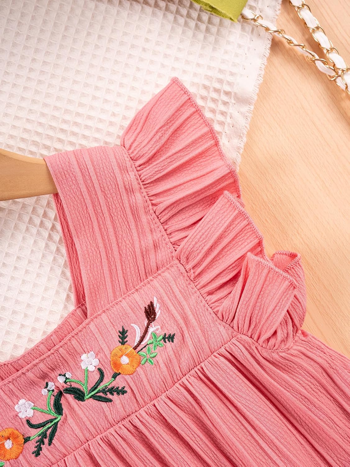 JiAmy Girl Dress Flowers Embroidery Flutter Sleeve Toddler Dresses Square Neck Ribbed Casual Clothes for 1-7 Year Old