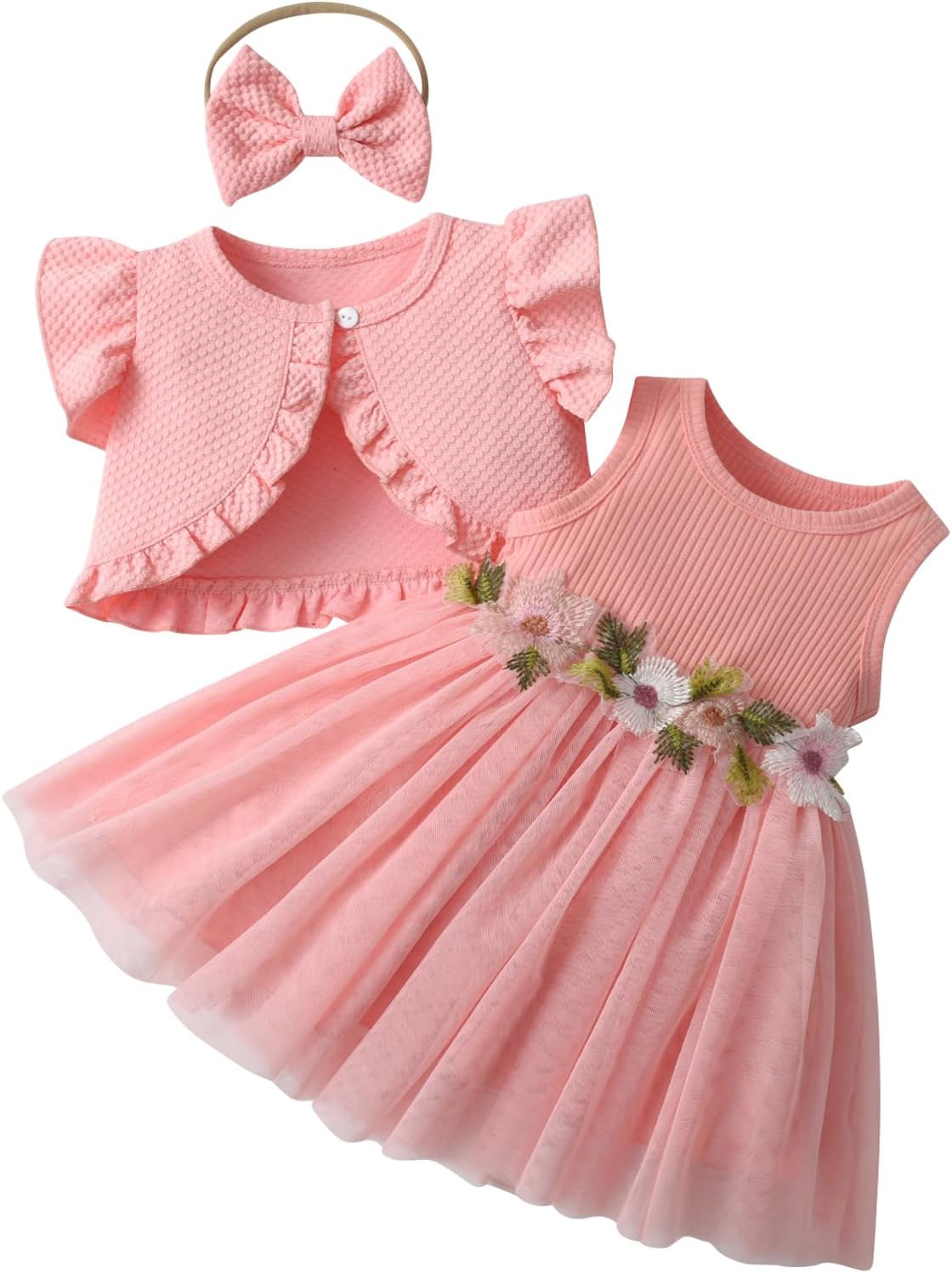 Kumsolu 3Pcs Summer Baby Girl Dress and Short Sleeve Cardigan Set Pink