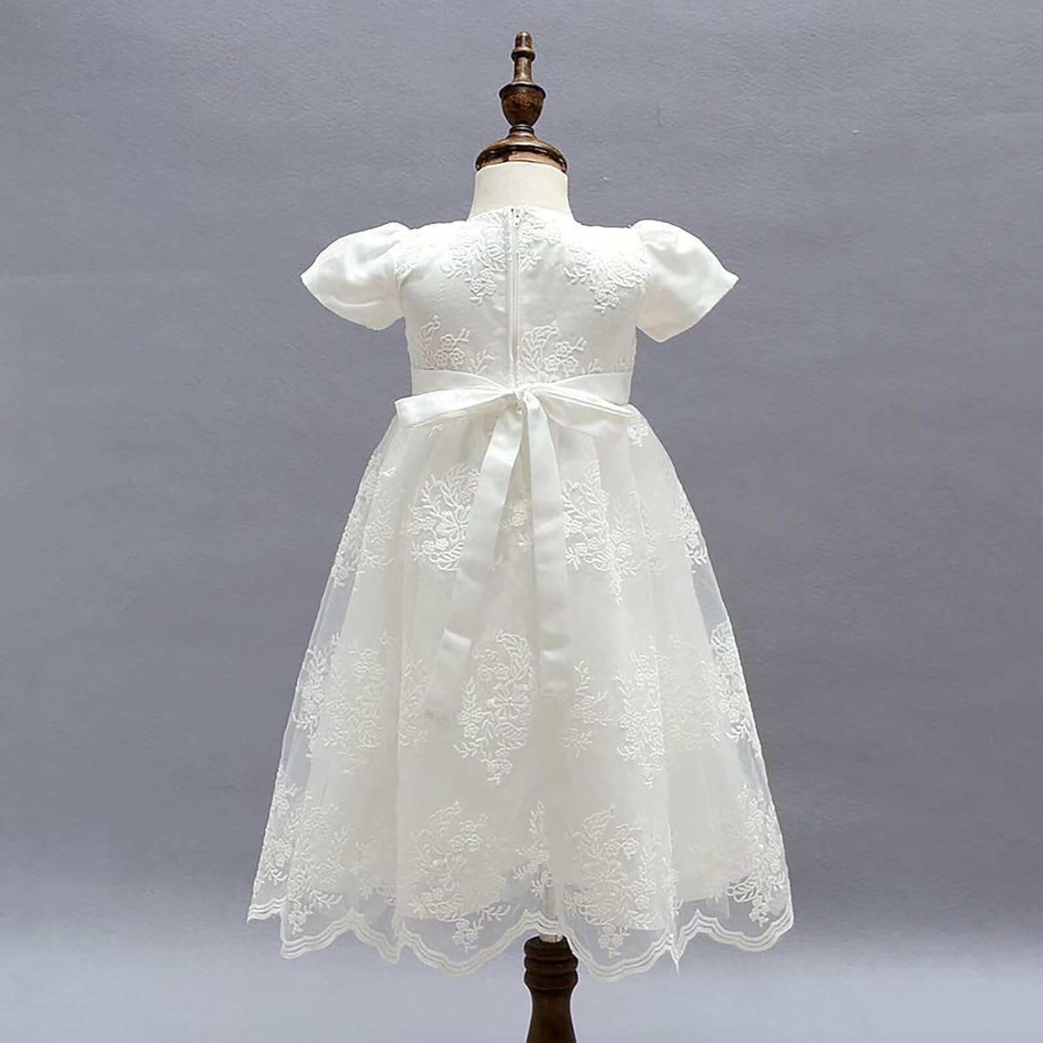 The invisible zip makes it easy to open and close the baby christening dress, providing a secure closure. The closure creates a seamless and glossy look. Its invisibility adds a touch of sophistication to girls’ dresses.