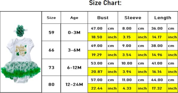 A Cute St Patrick dress is Suit for 0-3 Months, 3-6 Months, 6-9 Months, 9-12 Months, 12-18 Months, 18-24 Months newborn baby girls and infant baby and toddler.They will delighted with the dresses .