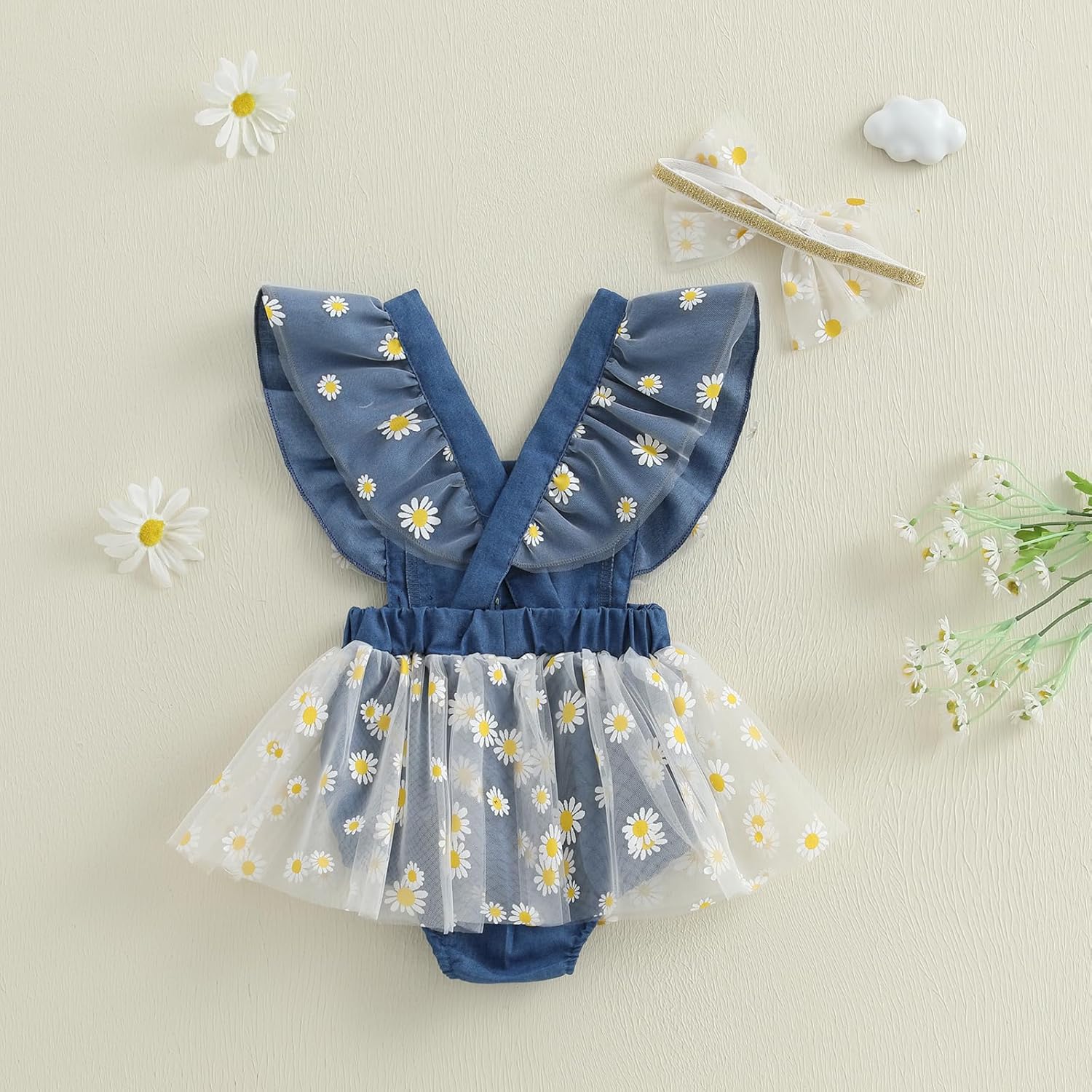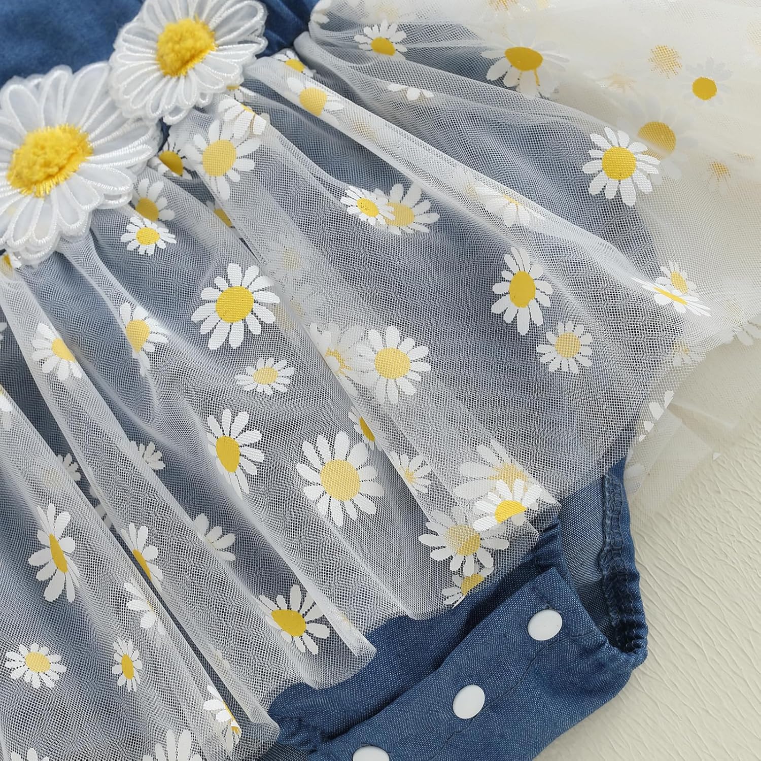 Toddler Baby Girl Summer Romper Dress Fly Sleeve Daisy Flower Embroidery Mesh Tulle Tutu Dresses Bodysuit with Headband