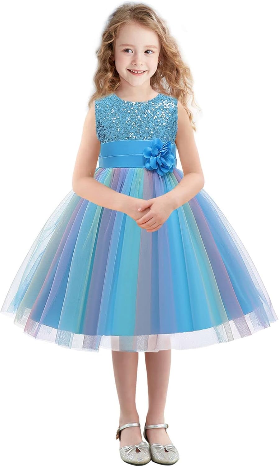 M MUNCASO Girls Princess Dress Sequin Tulle Flower Rainbow Round Collar Sleeveless Formal Dress Birthday Party Wedding Bridesmaid Girl Evening Dresses Toddler Baby Age for 2-13 Years