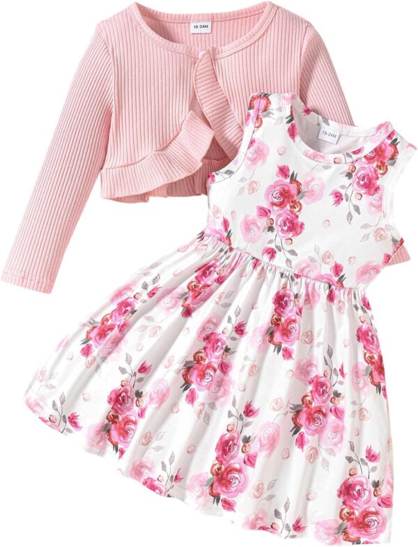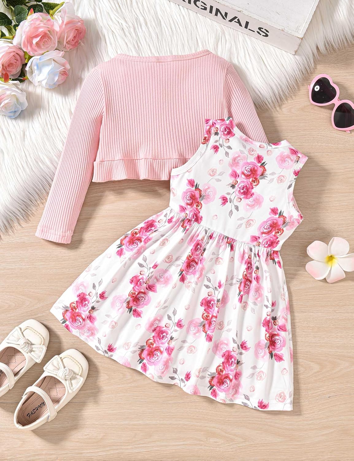 puseky Toddler Baby Girls Dress and Cardigan Set Baby Girl Floral Print Sleeveless Dress and Coat 2Pcs Fall Outfits Set