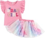 Toddler Baby Girl 1st Birthday Outfit Letter Print Ruffle Short Sleeve T Shirts Top Mesh Tutu Skirt Birthday Clothing Set Party Dress 2 Pcs Set