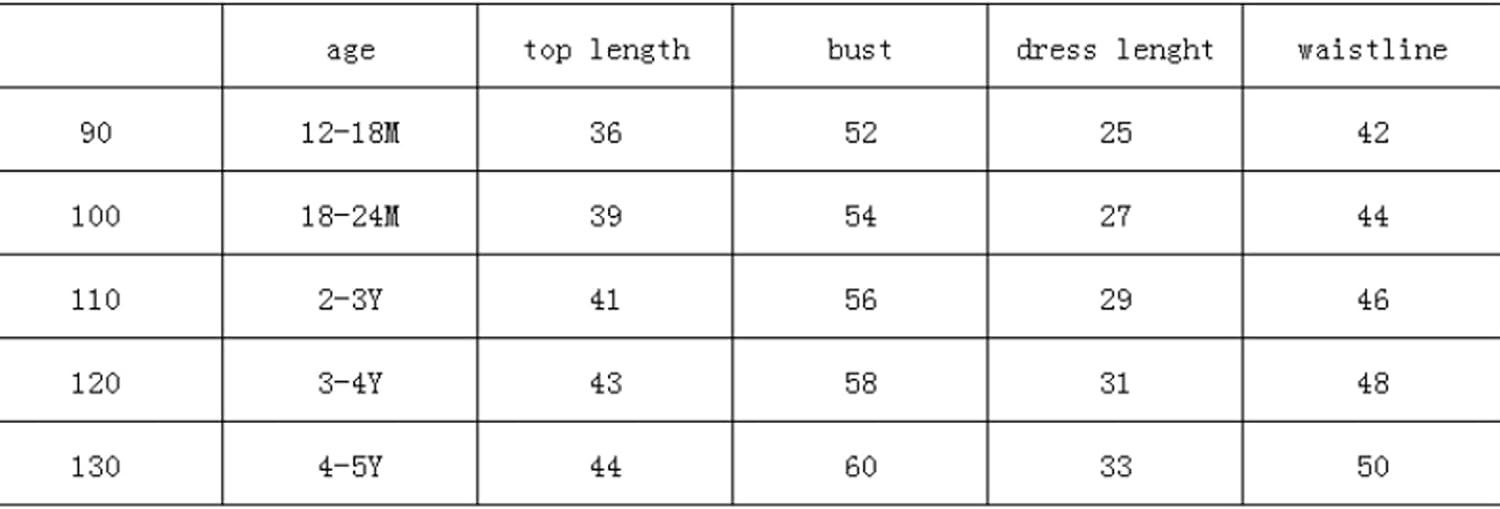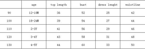 100 Tops Length: 39 Bust: 54 Skirt Length: 27 Waist: 44 Advised Age: 18-24 Months