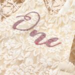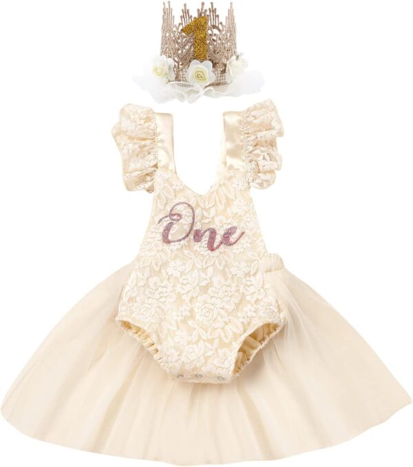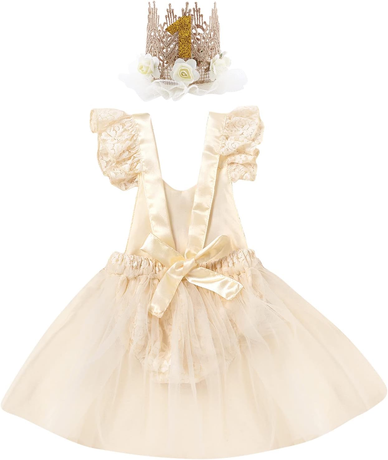 Baby Girls 1st Birthday Cake Smash Fly Sleeve Lace Romper Dress Princess Backless Bodysuit Tulle Tutu Dress with Flower Crown Headband Outfit