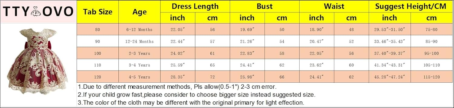 Size 70 (0-6 Months) Chest 52cm/20.47″—–Clothing Length 50cm/19.69″Size 80 (6-12 Months) Chest 53cm/20.87″—–Clothing Length 51cm/20.08″Size 90 (12-14 Months) Chest 54cm/21.26″—–Clothing Length 53cm/20.87″Size 100 (2-3 Years) Chest 56cm/22.05″ —– Dress Length 57cm/22.44″Size 110 (3-4 Years) Chest 59cm/23.23″—–Clothing Length 59cm/23.23″Size 120 (4-5 Years) Chest 62cm/24.41″—–Clothing Length 68cm/26.77″