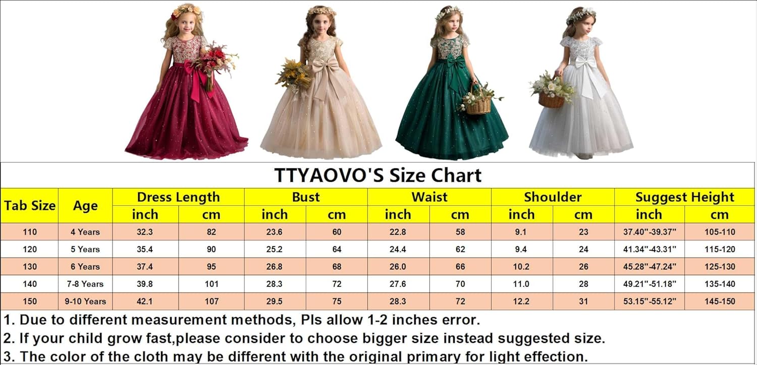 Size Information (in inch)Size 110=4 Years, Bust: 23.6″ —-Waist: 22.8″ —-Dress Length: 32.3″Size 120=5 Years, Bust: 25.2″ —-Waist: 24.4″ —-Dress Length: 35.4″Size 130=6 Years, Bust: 26.8″ —-Waist: 26.0″ —-Dress Length: 37.4″Size 140=7-8 Years, Bust: 28.3″ —-Waist: 28.6″ —-Dress Length: 39.8″Size 150=9-10 Years, Bust: 29.5″ —-Waist: 28.3″ —-Dress Length: 42.1″
