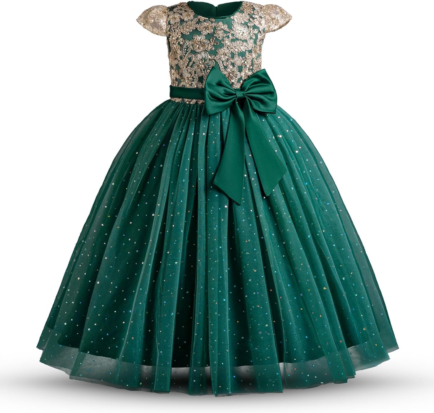 Material: 65% Polyester, 35% Viscose.Pattern Type: Stitching.Fit Type: Girls Party dress, Lace Dress for Girls, Kids Tulle Dresses, Prom Gowns.Feature: Lace Embroidery, Waist Bow, Sequins Decoration for 4-10 Years old Girls.Occasion: Birthday Party, Wedding Party, Family Gathering, Photography Shoot, School Prom, Beauty Pageant, Christmas Day, Festival Celebration.