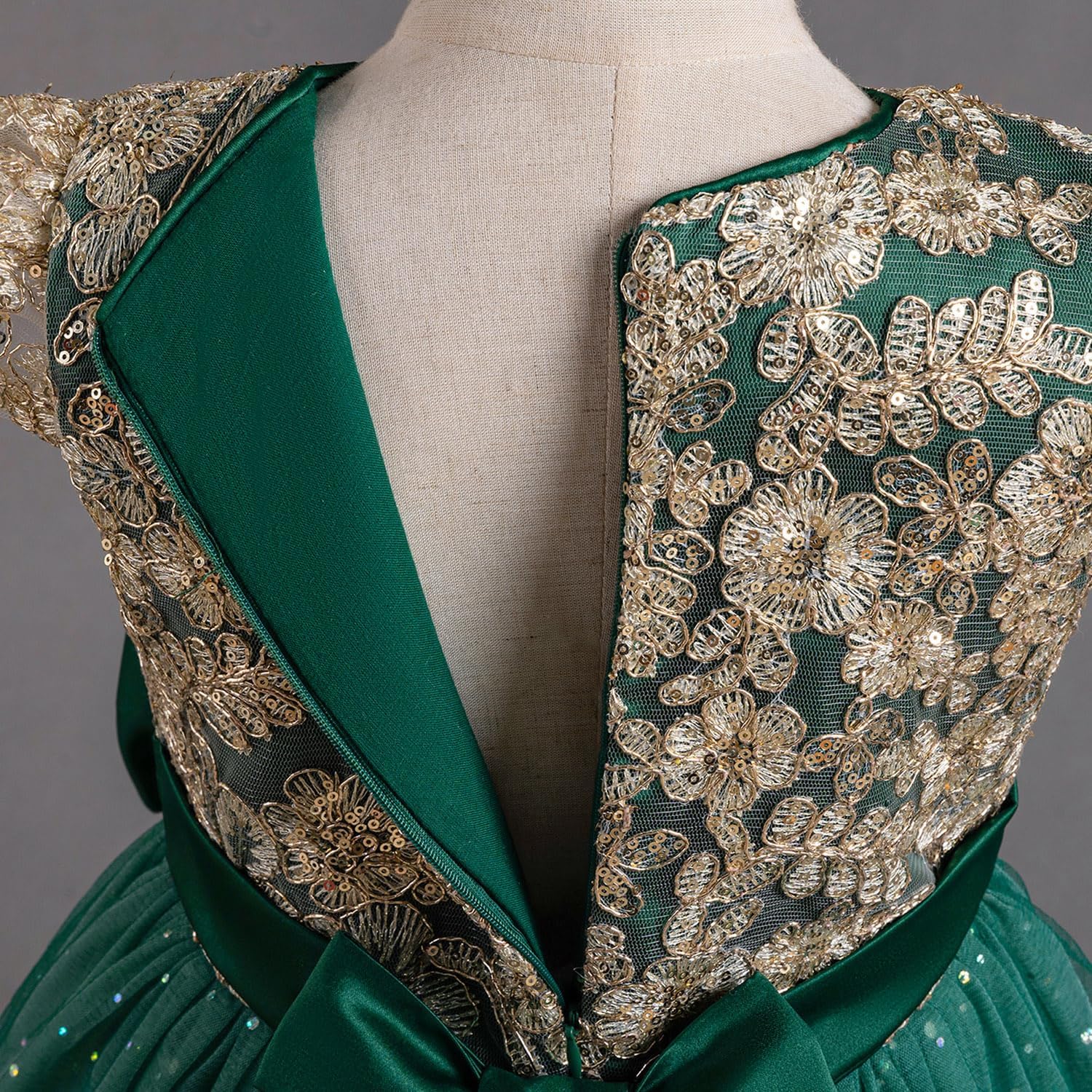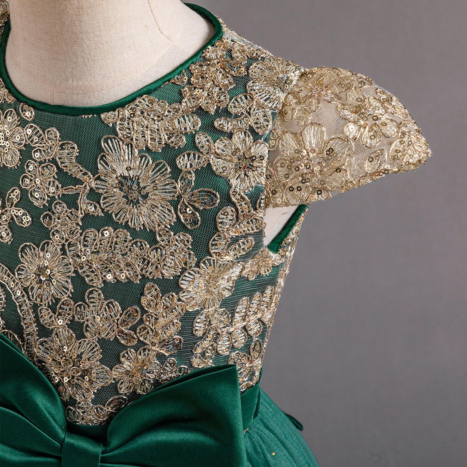 Exquisite Elegance in Every Detail, our opulent girls’ formal dress is an epitome of refined elegance. Featuring intricate golden lace designs, this dress boasts sophistication in every stitch and detail. Available in four stunning hues – Burgundy Red, Champagne, Green, and White – offering a palette to match varied tastes and occasions.