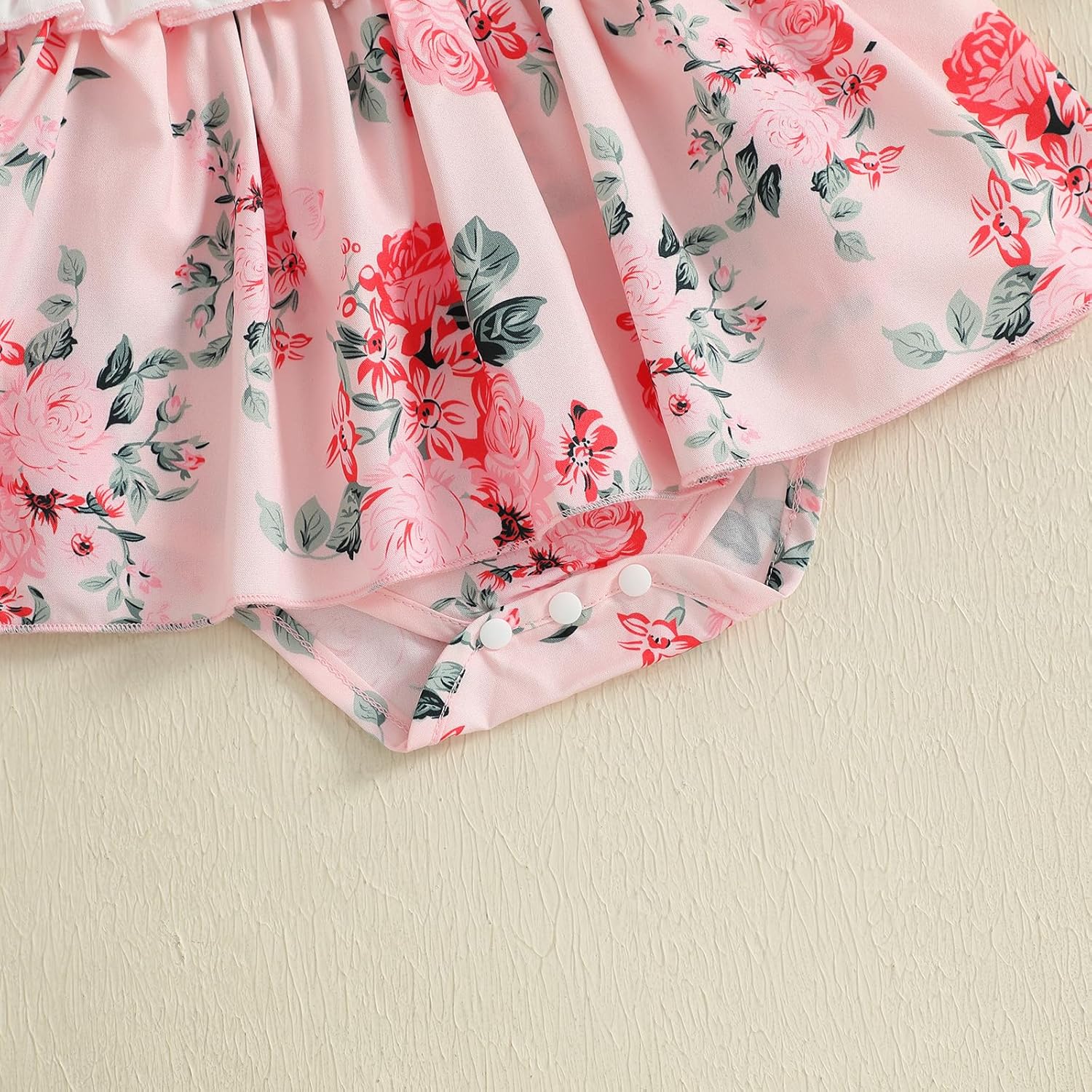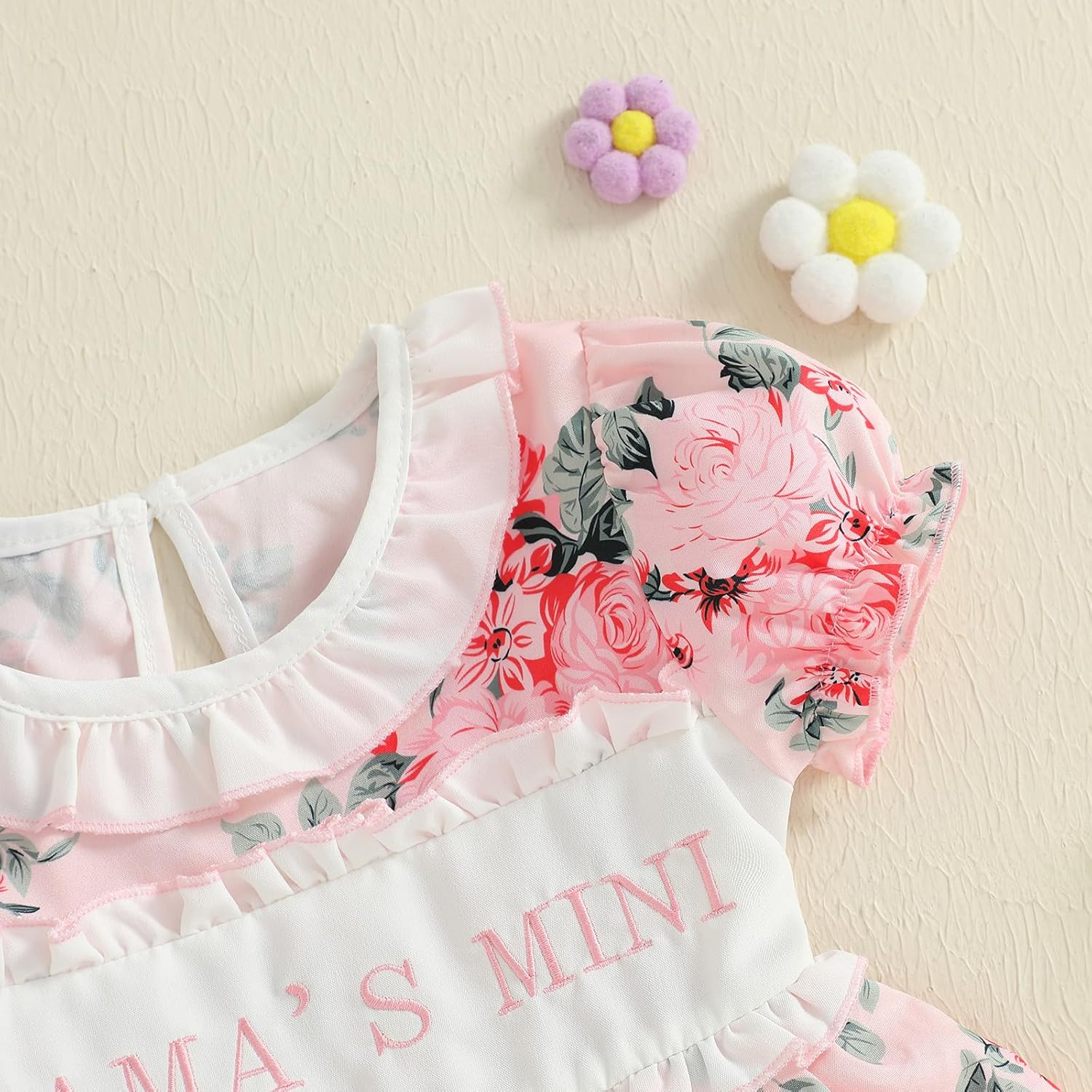 Baby girl’s summer romper with floral print and letter embroidery adds a touch of cuteness to your baby’s closet; Short sleeves, round neckline, and ruffles, simple yet stylish, make your baby even more adorable