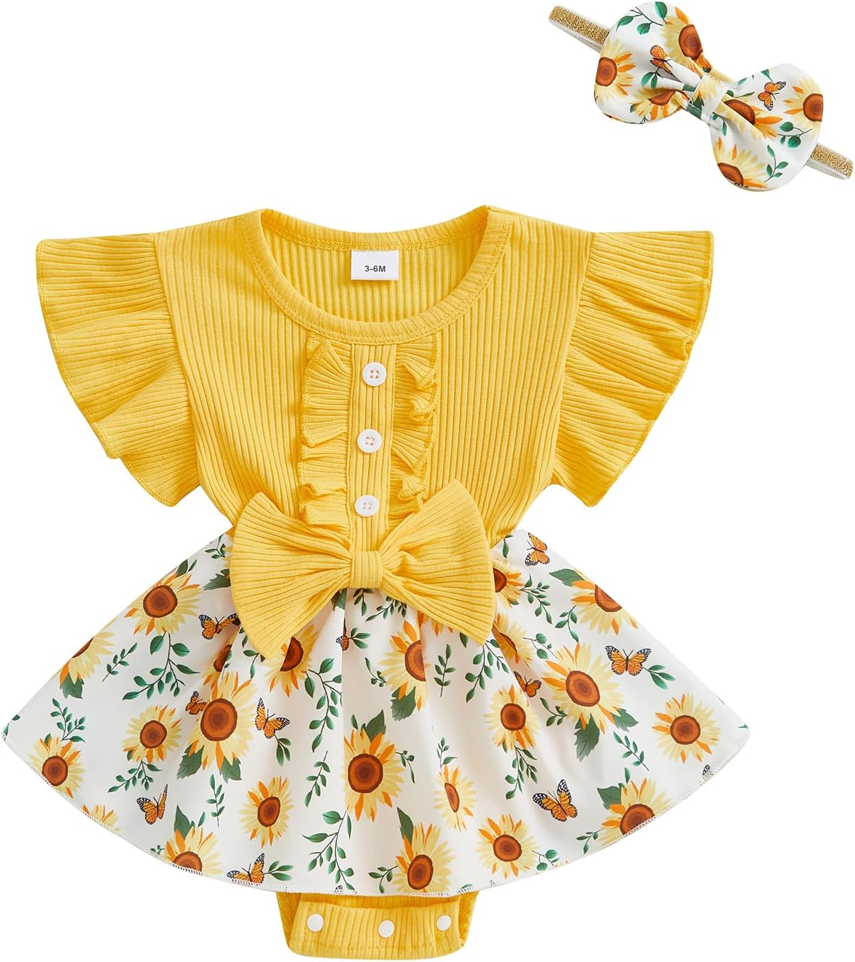 XIXIMAON Toddler Baby Girl Summer Outfit Sunflower Butterfly Print Ruffled Flying Sleeve Shirt Ribbed Romper Dress Bow Headband Newborn Clothes Girls