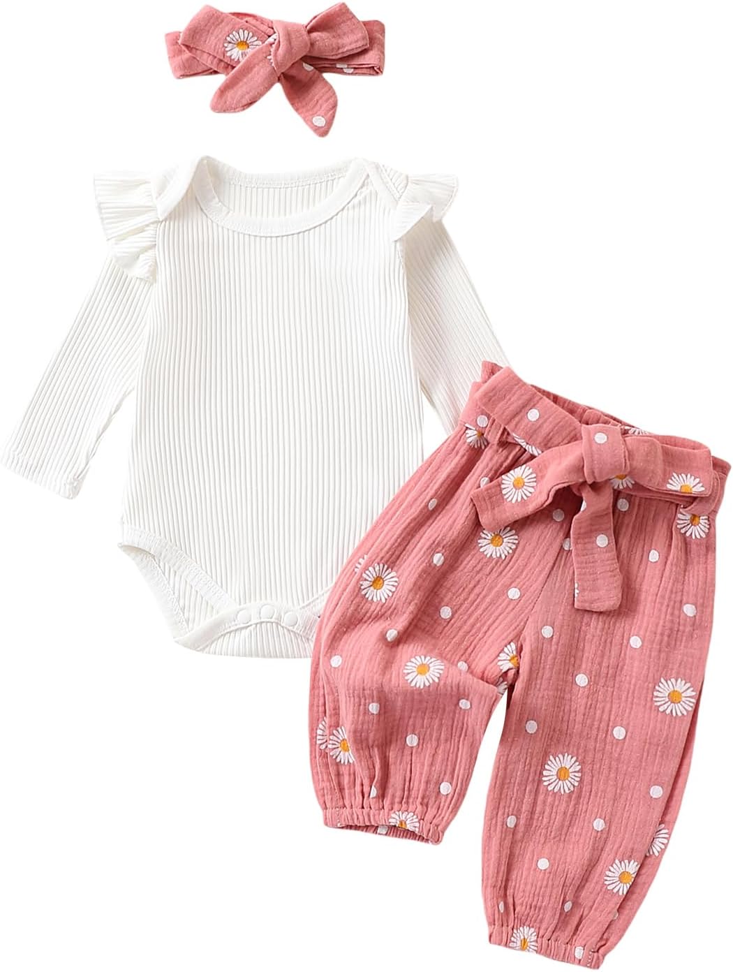 Yoisdtxc Infant Baby Girl Clothes White Rib Long Sleeve Romper Daisy Flared Pants Headband Set 3pcs Outfits