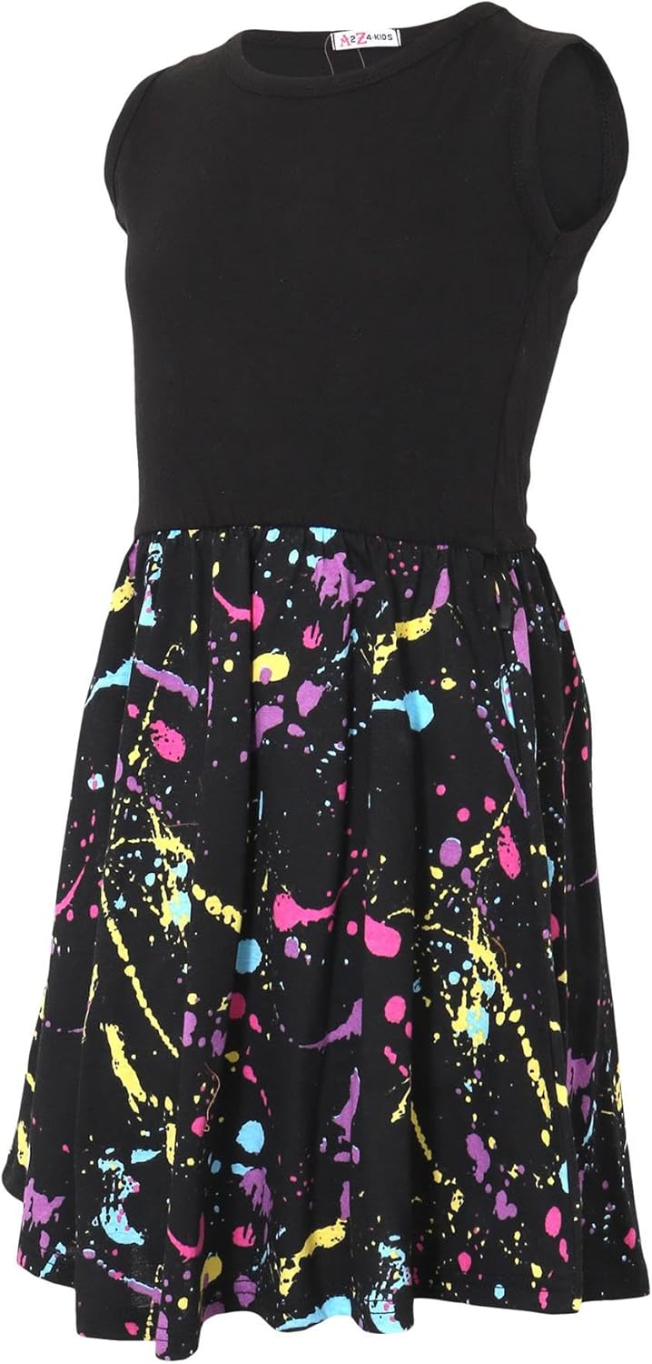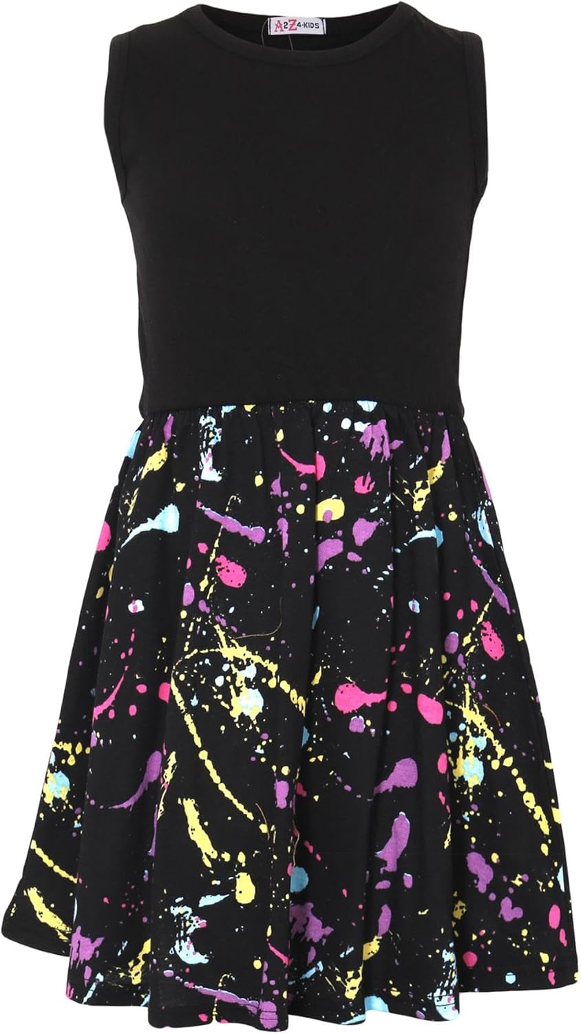 A2Z 4 Kids Girls Black Panel Skater Dress Pastel Splash Print Fashion Party Top Summer Dresses New Age 5 6 7 8 9 10 11 12 13 Years