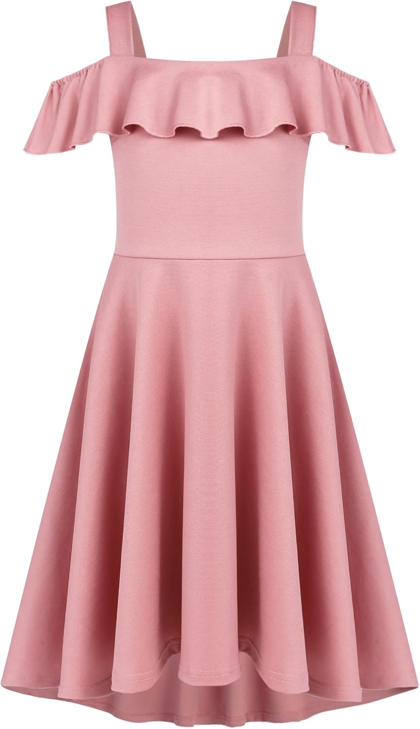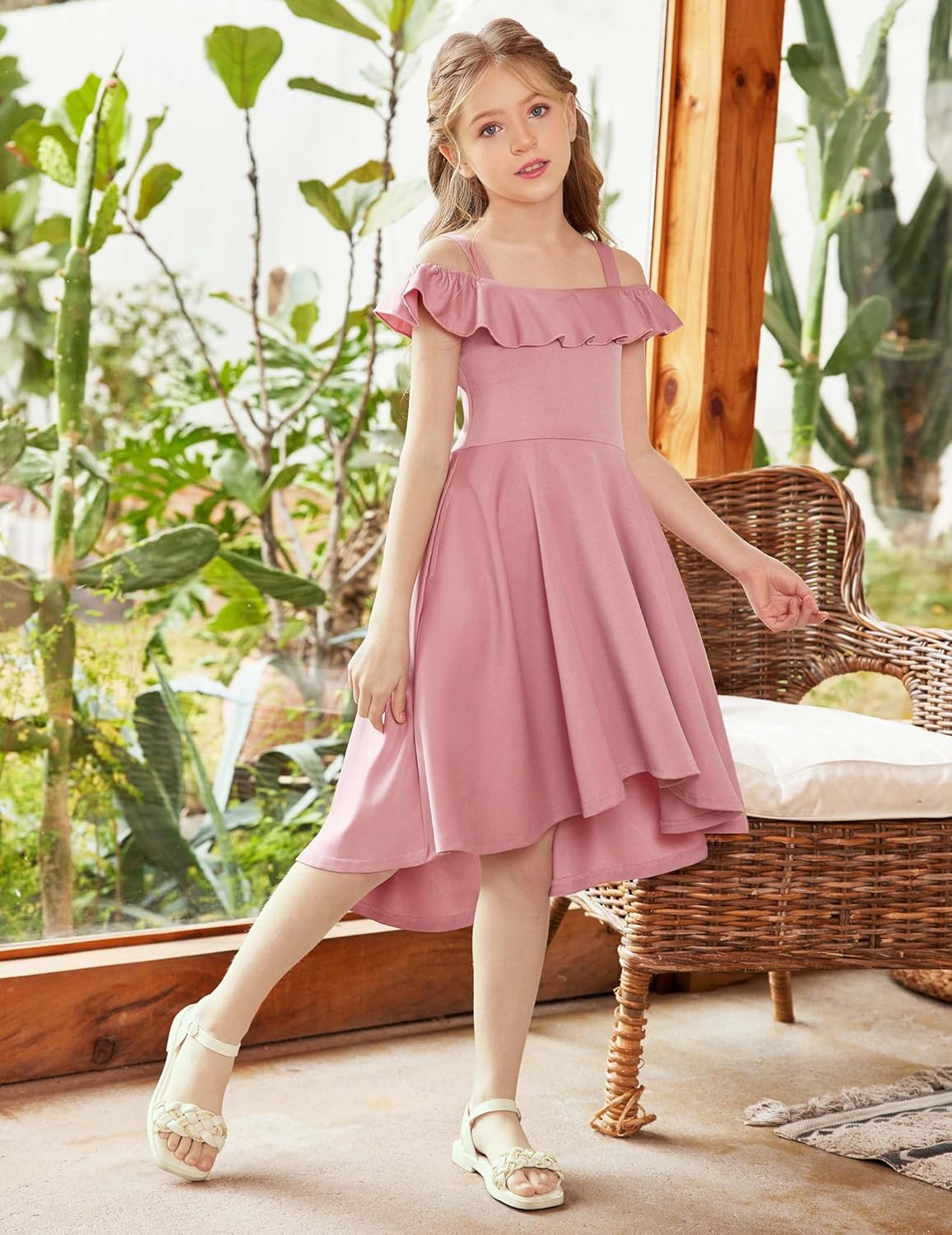 Arshiner Girls Summer Dress Off Shoulder Children’s Dress Ruffle Sleeves Elegant Strap Dress Children A Line Swing Dress High Low Dress Casual Dresses with Pocket 4-13Years