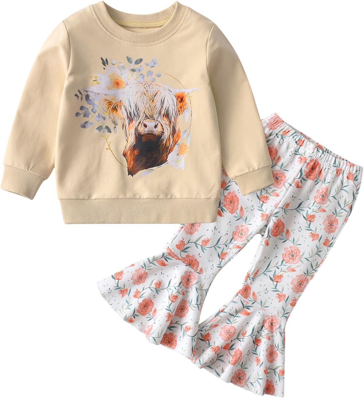 Awxoder Toddler Baby Girl Clothes Printed Design Tops + Floral Pants Little Girl Outfit Set