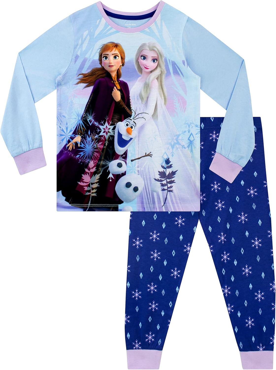 Girls Frozen 3-piece pyjama set. The cold won’t be bothering her when she puts on these Frozen pjs with cosy matching dressing gown! With the pj top showcasing a print of iconic sisters Elsa and Anna along with the playful Olaf and the bottoms featuring a snowflake pattern, these icy blue and pink pjs are a must-have for any Frozen fan. Perfect for sleepovers and movie nights watching her favourite Disney franchise!
