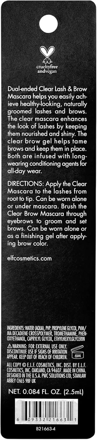 e.l.f. Cosmetics Clear Brow and Lash Mascara helps you achieve glossy, shiny, healthy-looking lashes and brows, infused with long-wearing conditioning agents. Flawless lashes and brows have never been easier. Compact design ideal for travel or on the go.