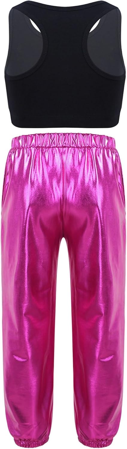Freebily 2Pcs Girls Hip Hop Street Dance Clothes Set Crop Tank Top and Metallic Pants Stage Performance