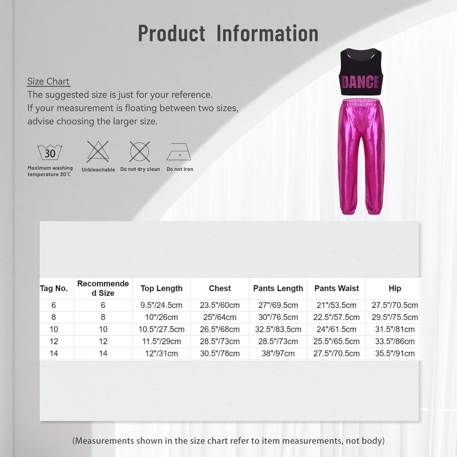 Tag No.—|—Recommended Size—|—-Top Length—-|——Chest—–|—Pants Length—|—-Pants Waist—|——–Hip—-