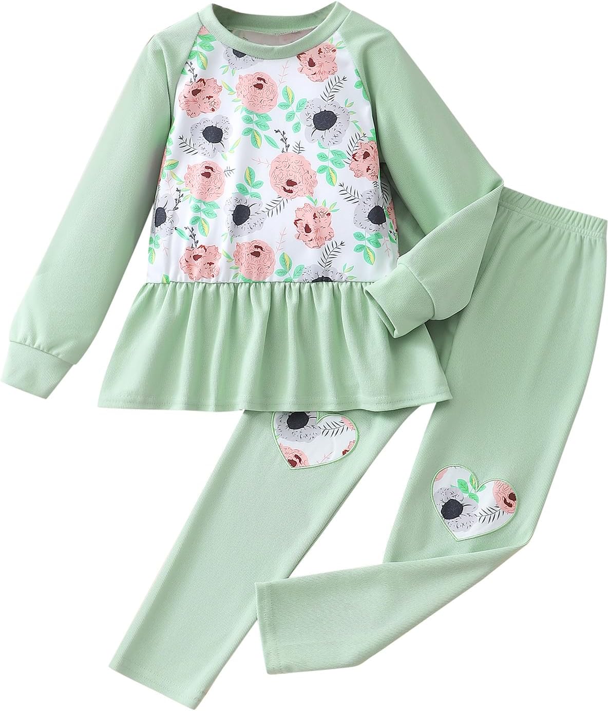 Girls Raglan Sleeve Top Ruffle Trouser Set Flower Print Ruffle Tshirt Dress Heart Pants 2 Piece Outfits Clothes Set