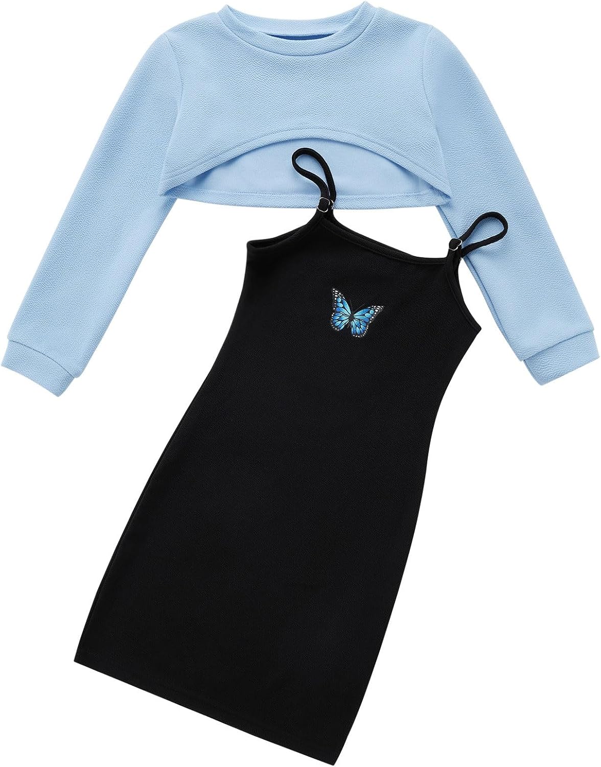 Girl’s 2 Piece Outfits Kids Long Sleeve Crop Top and Cami Dress Set Teen Girls Pullover Sweatshirt + Butterfly/Plaid Print Bodycon Dress Clothes Christmas Party Casual Costumes