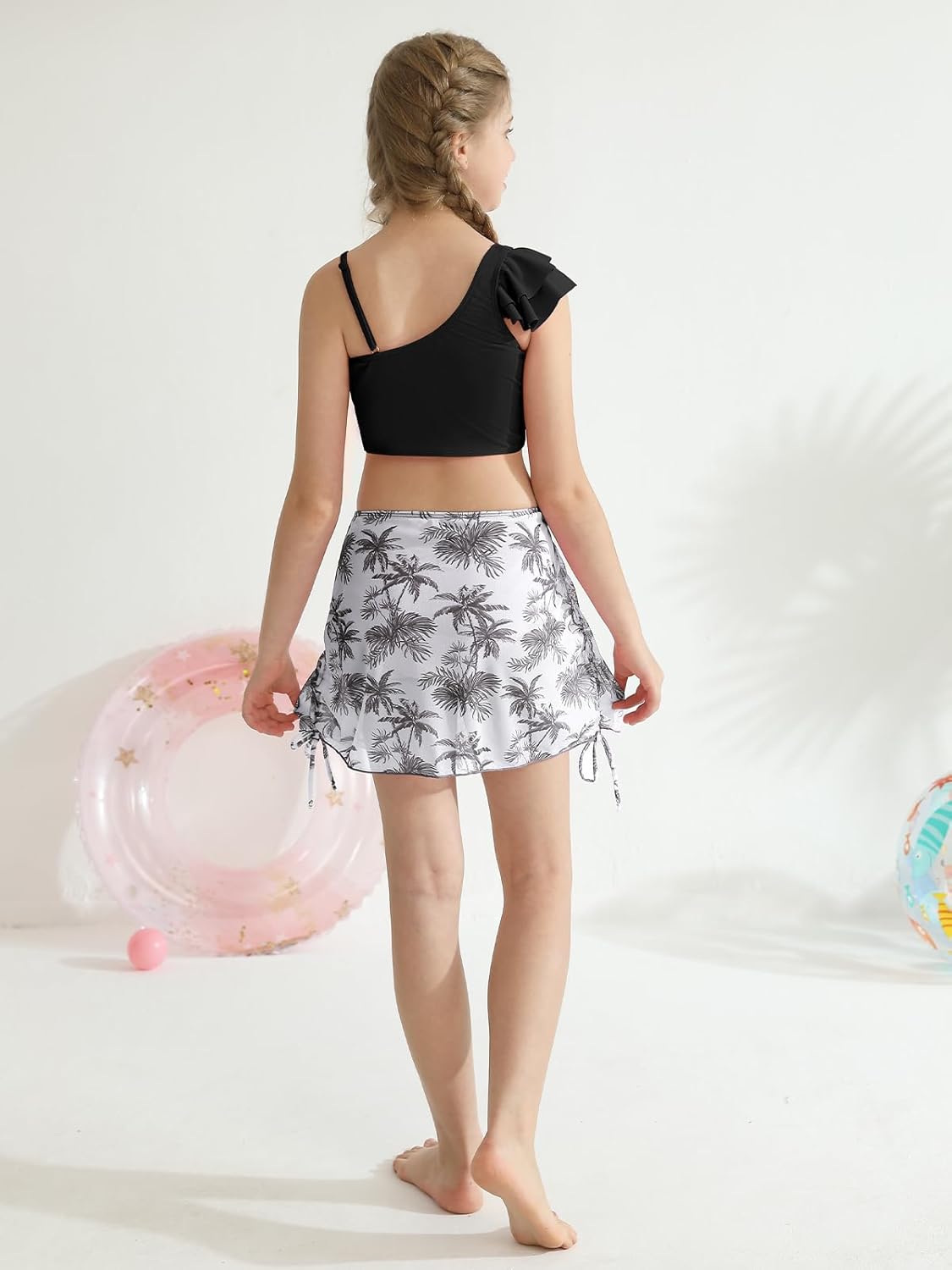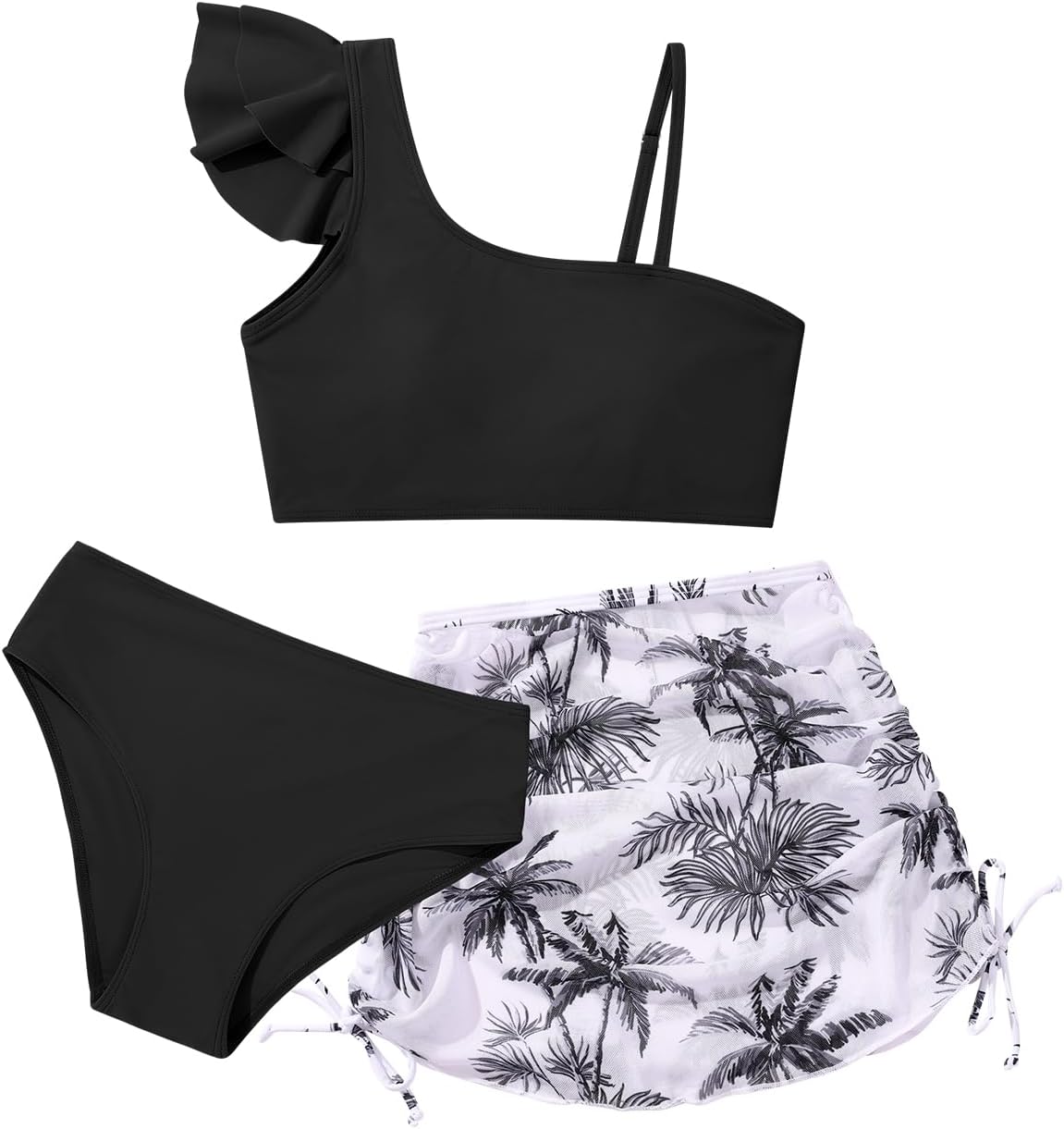 Girls 3 Piece Swimsuits Ruffle Sleeve Bikini Set with Tropical Cover Up Skirts High Waist Bathing Suit Bikini Tops Pants Summer Holiday Beachwear for Kids Teen 9-16 Years