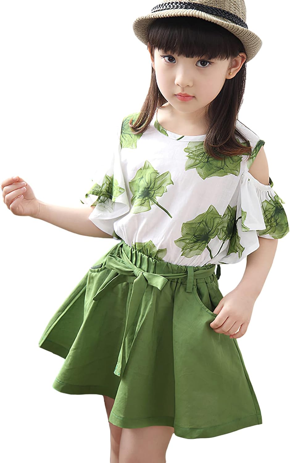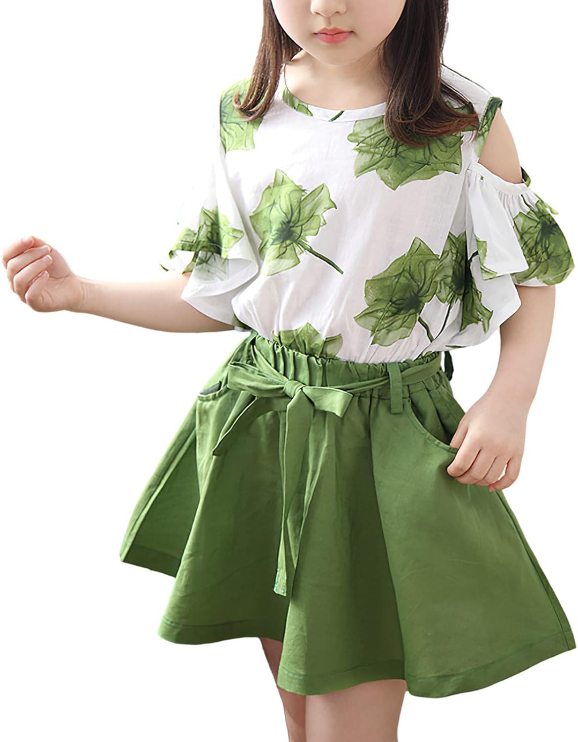 Girls Summer Flower Clothes Set Ruffle Sleeve T-Shirts and Mini Skirt 2Pcs Outfits for Age 3-12 Years