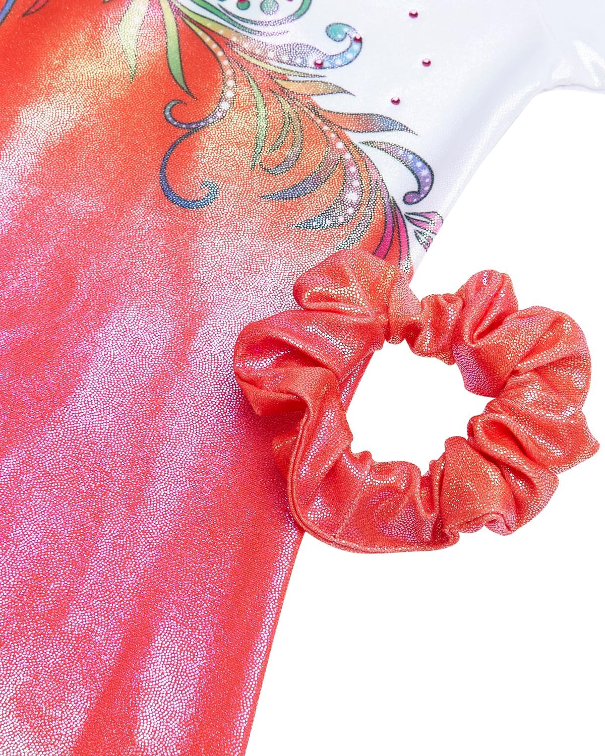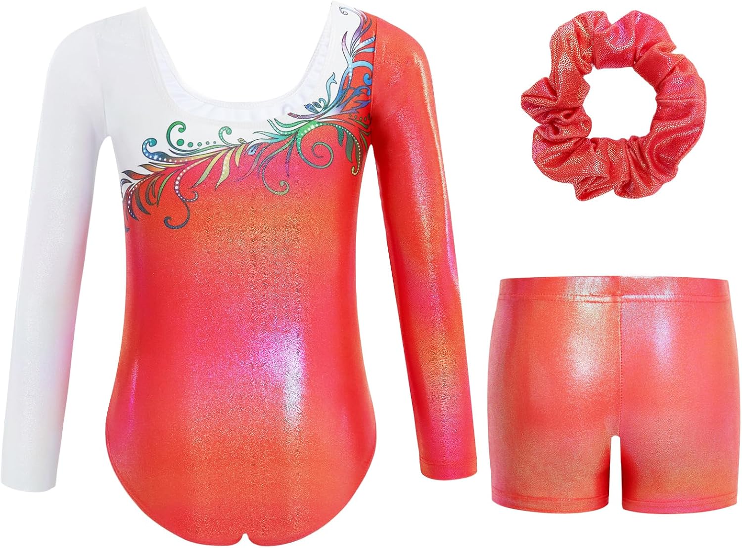 Gogokids Girls’ Three-Piece Longsleeve Gymnastics Leotard Set – Kids Gymnastics Outfits with Gradient Sequin Design Includes Leotard, Shorts and Hair Tie, Sparkling Ballet Unitards for Ages 3-12
