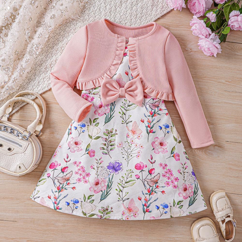 JiAmy Girls Dress and Cardigan Set Toddler Long Sleeve Knitted Coat Sleeveless Floral Print Dresses with Bow 2 Piece Outfits Clothes for Girl 12 Months-7 Years