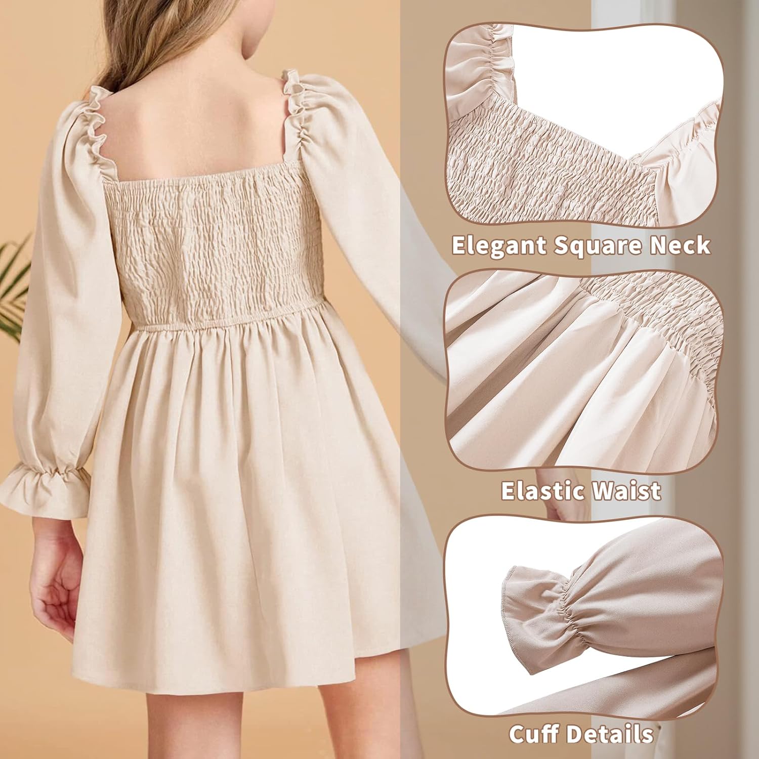 JiAmy Girls Dress Long Sleeve Square Neck Dresses Spring Summer Kids Casual Elegant Wedding Party A-Line Skirt Clothes for Girl 4-14 Years