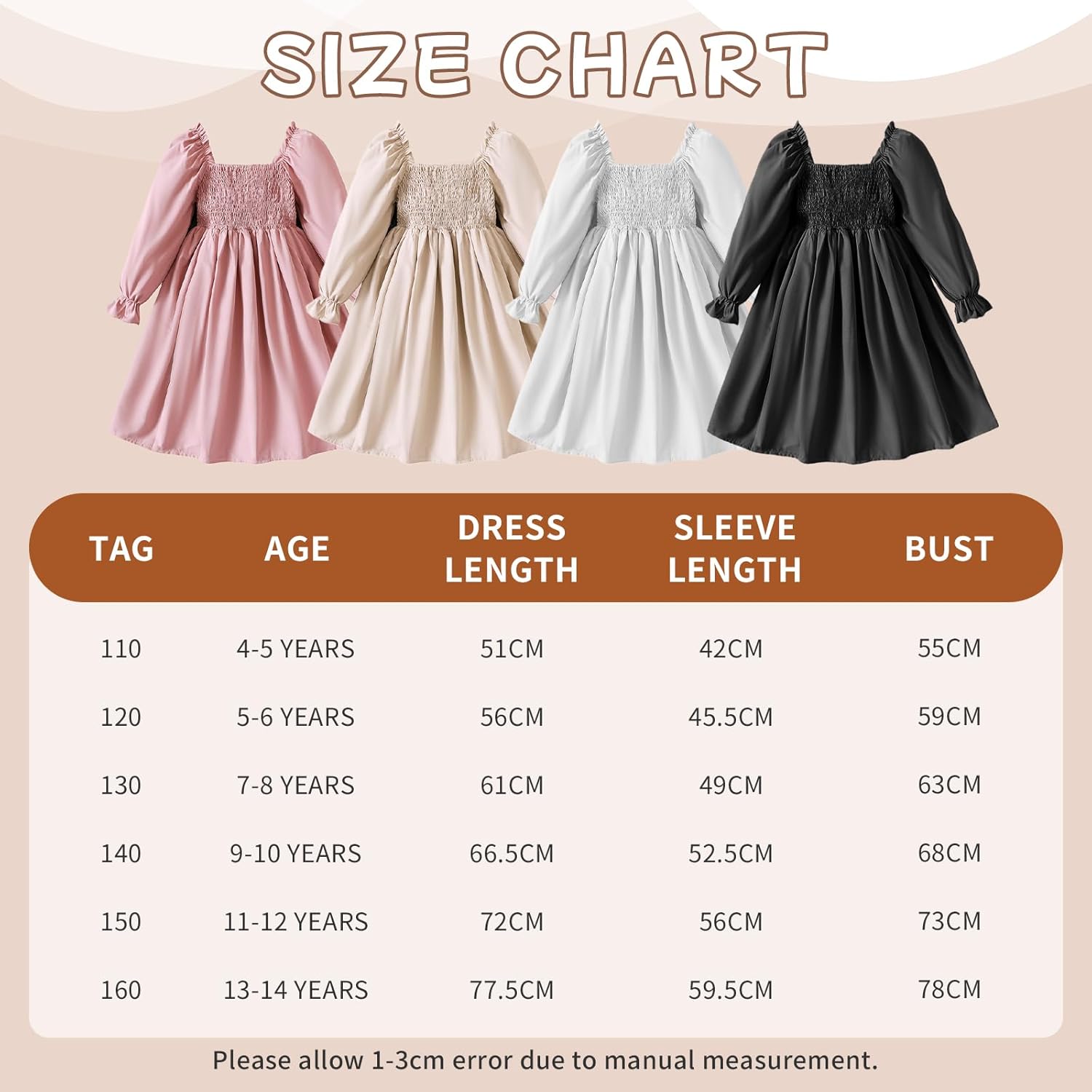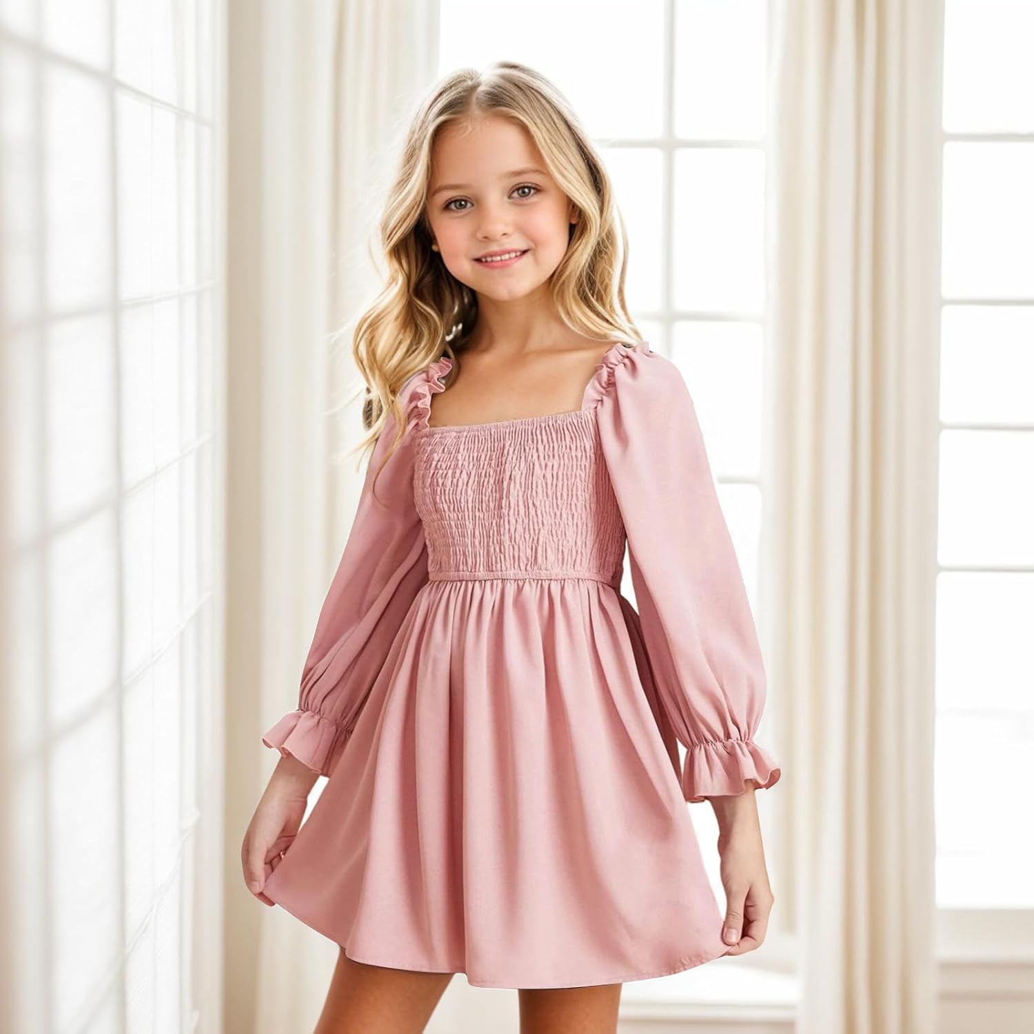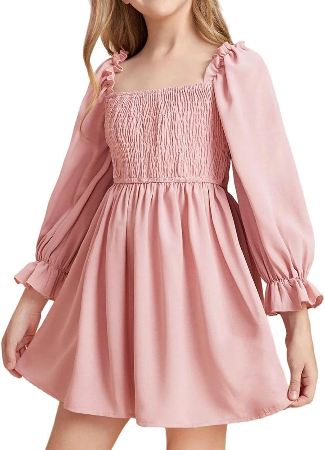 JiAmy Girls Dress Long Sleeve Square Neck Dresses Spring Summer Kids Casual Elegant Wedding Party A-Line Skirt Clothes for Girl 4-14 Years