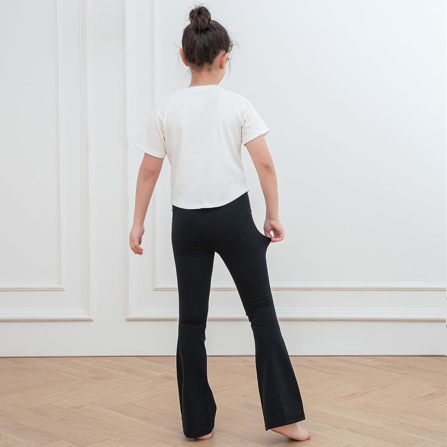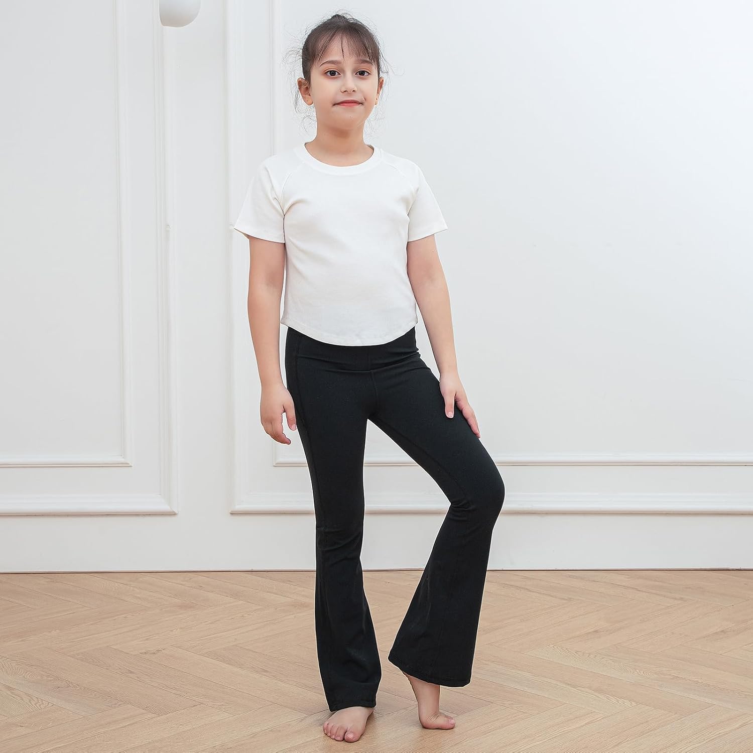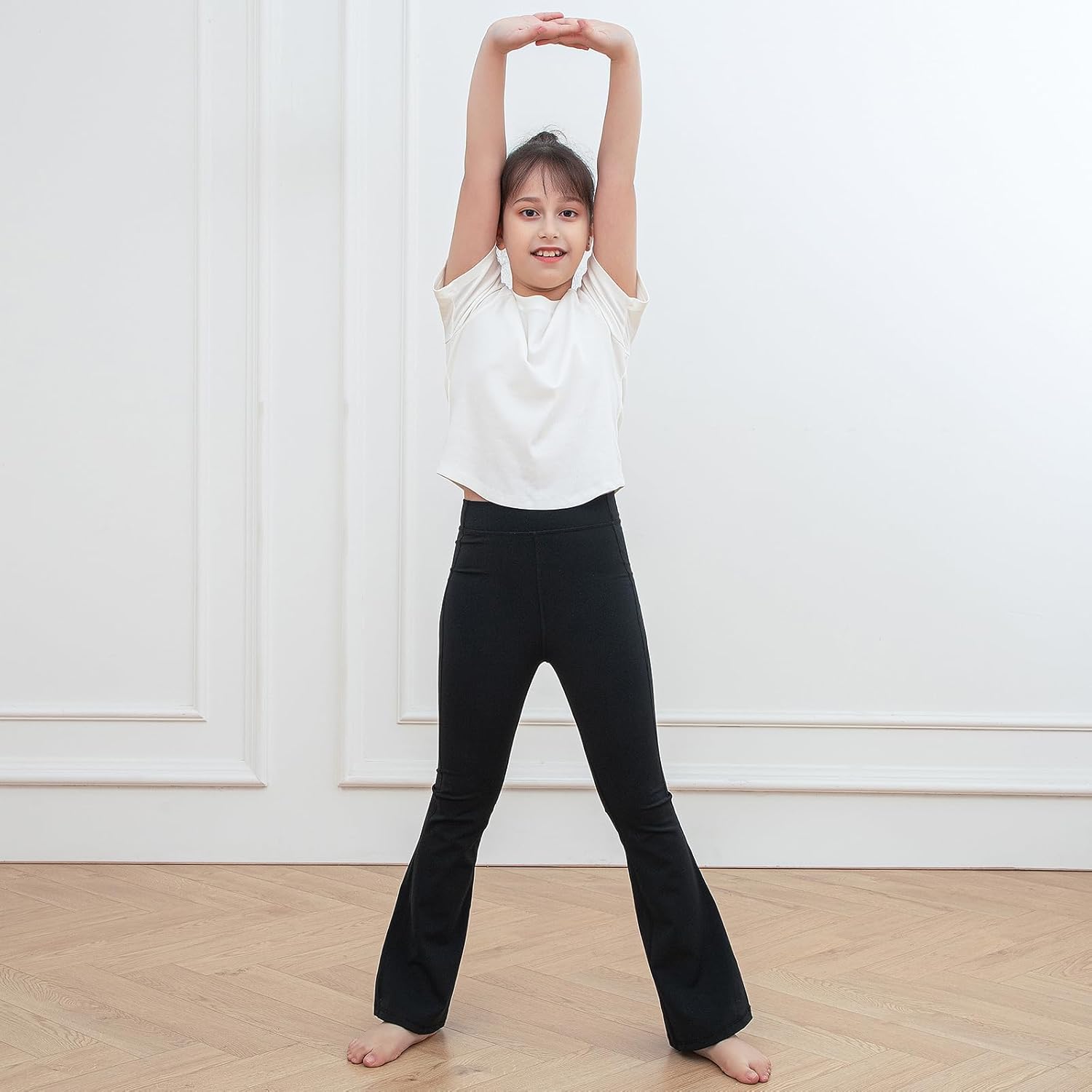 KAKU NANU Girls Flared Legging High Waisted 5-12 Years School Trousers Black Grey Yoga Pants Sports Dance Joggers Leggings
