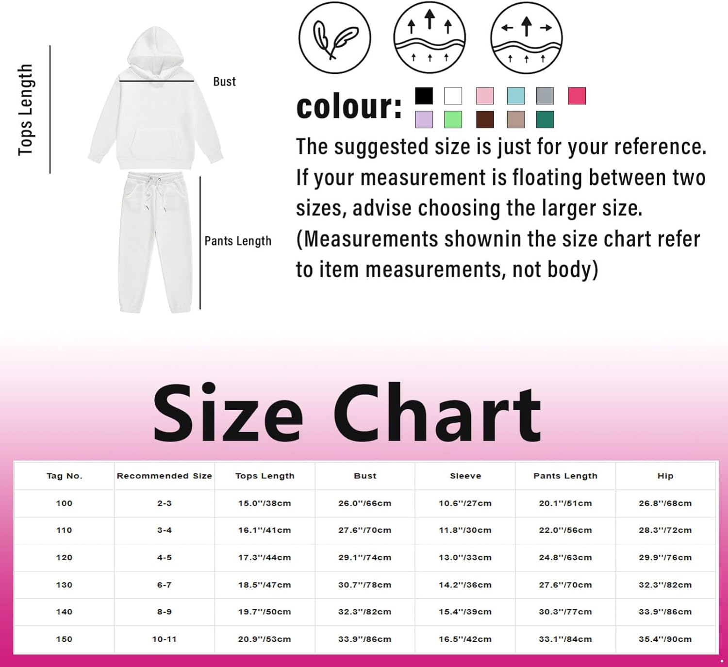 Tag No.—|—Recommended Size—|——-Chest——-|——Waist——|——-Sleeve——|—-Top Length—|—Bottom Length