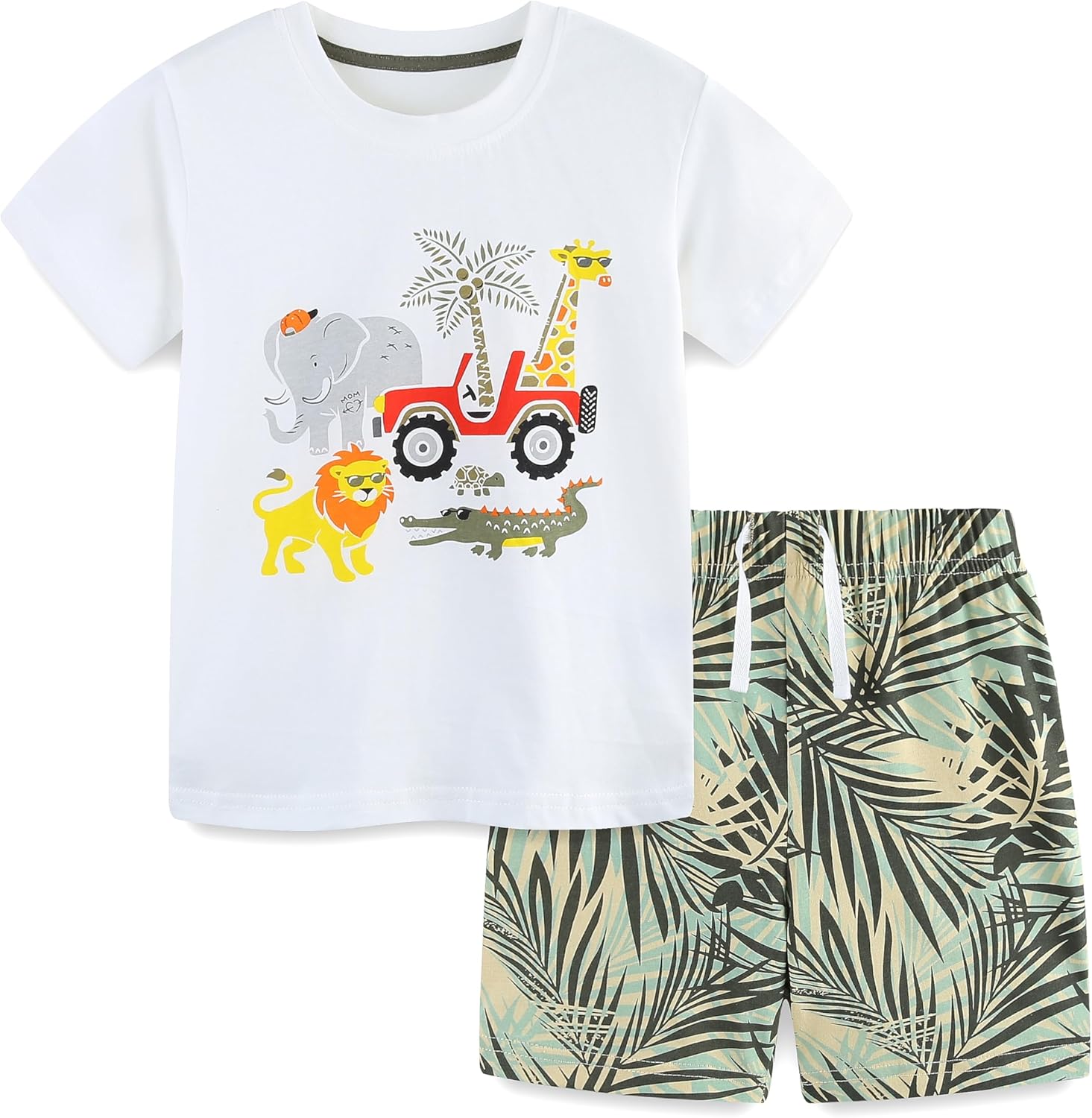 Kids Boys Summer Short Outfits Clothes Set Toddler Cool Dinosaur Digger Shark Animal Print Short Sleeve Cotton T-Shirt Tops and Shorts 2Pcs Crewneck Clothing Set Age 1-7 Years Old