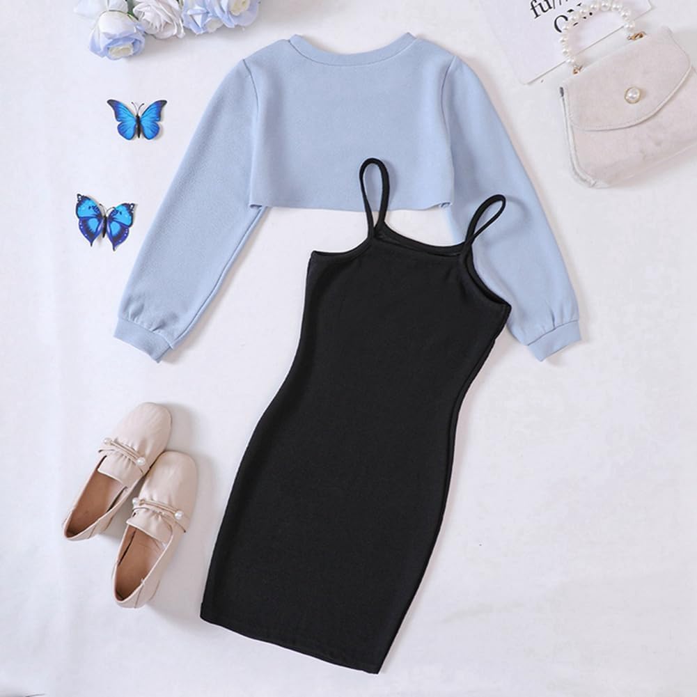 Girls 2Pcs Outfits: This kids outfits girls set includes a sleeveless slim fit dress and a long sleeve crop top, offering versatile styling options for teen girls. The design is perfect for fall,spring and Summer,ensuring stylish and comfortable wear for indoor and outdoor activities.