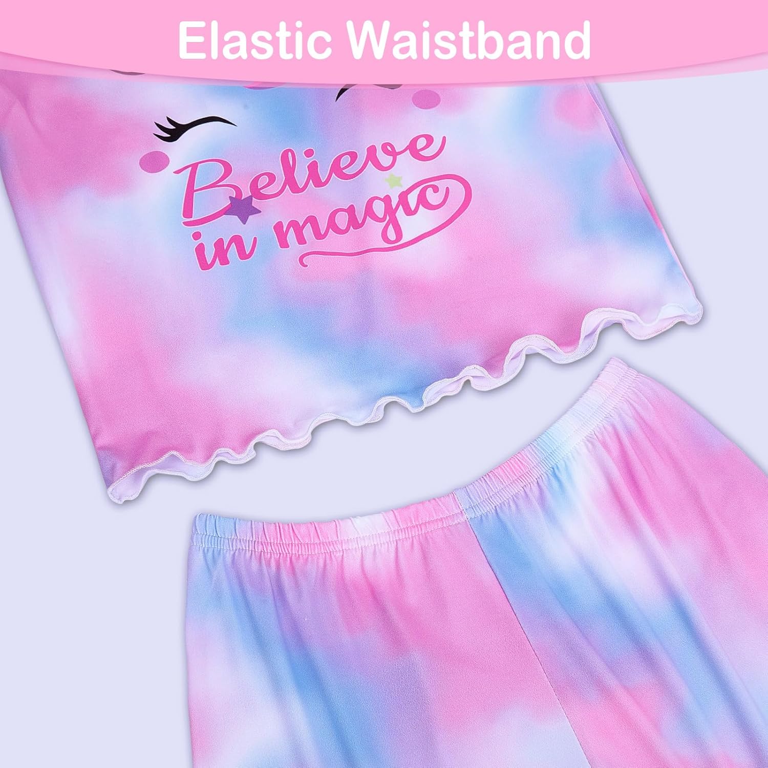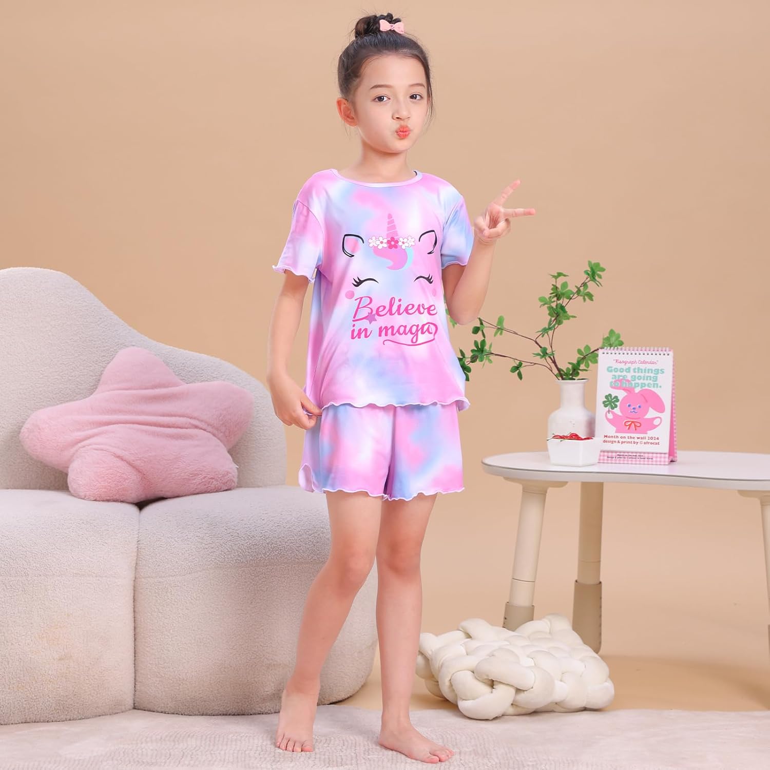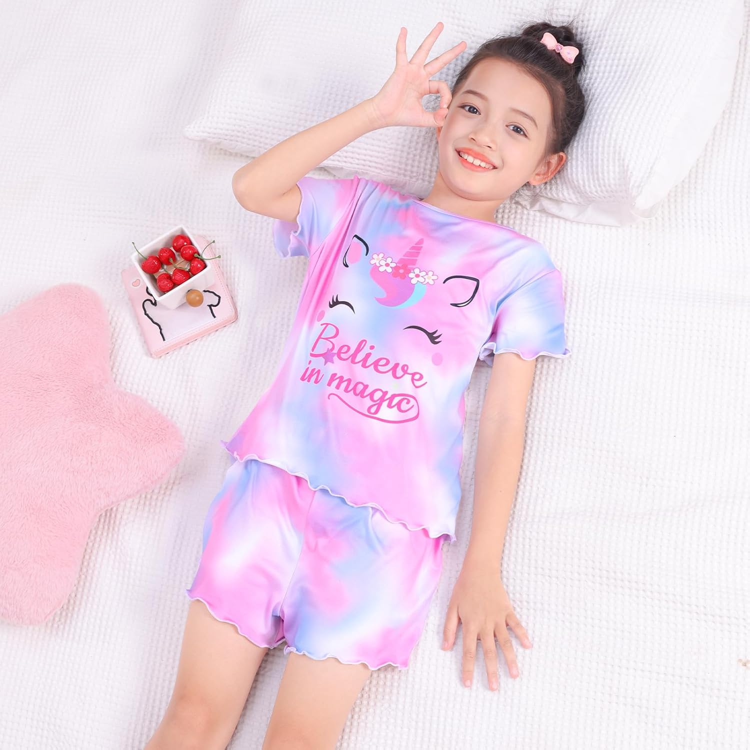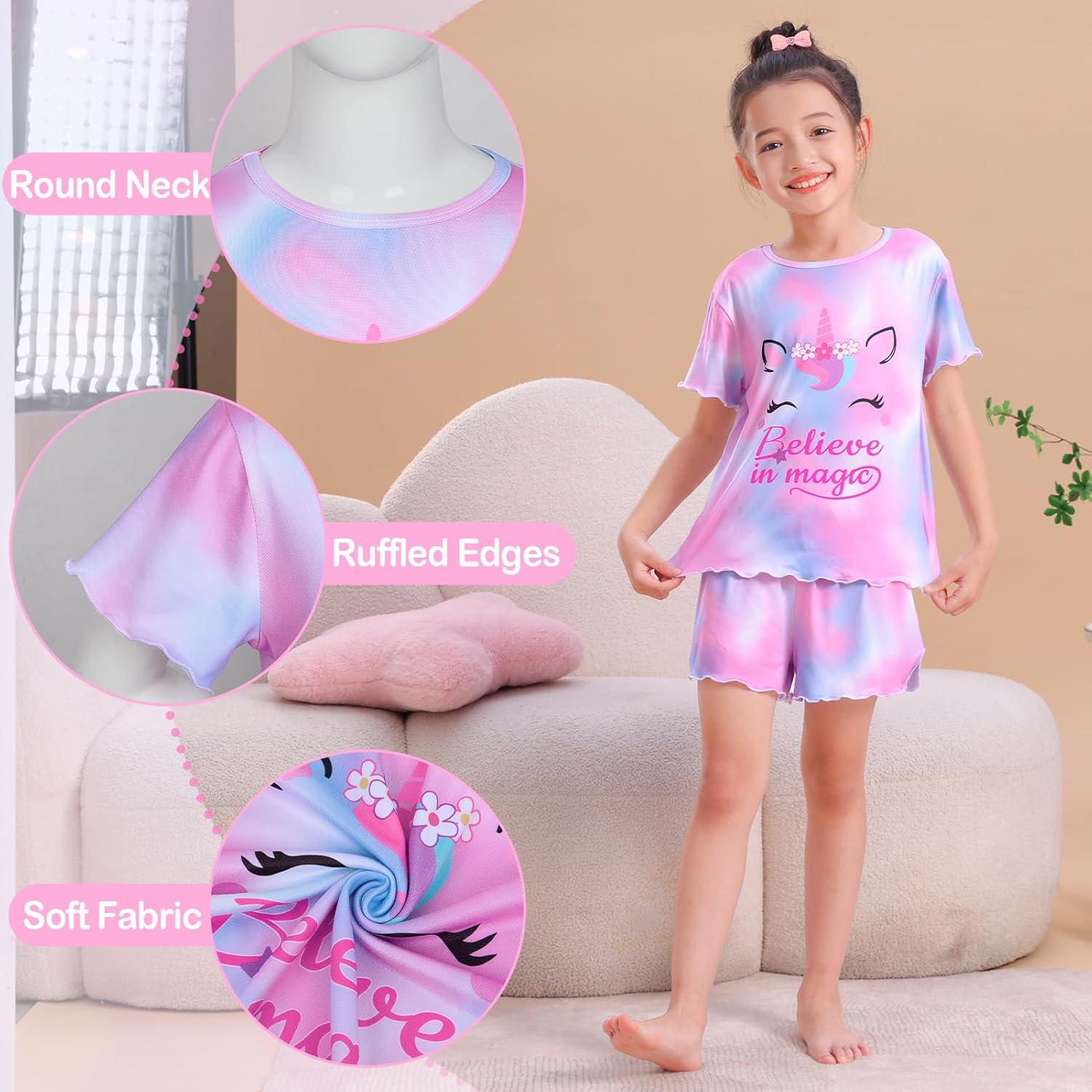 MHJY Girls Pyjamas Ruffled Short Sleeve PJs Sets Unicorn Pajamas 2 Pcs Shirt and Shorts Casual Girls’ Nightwear Sleepwear Clothes