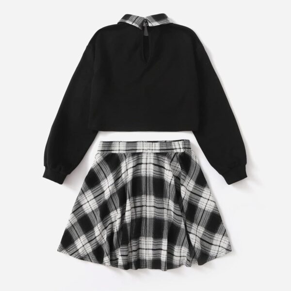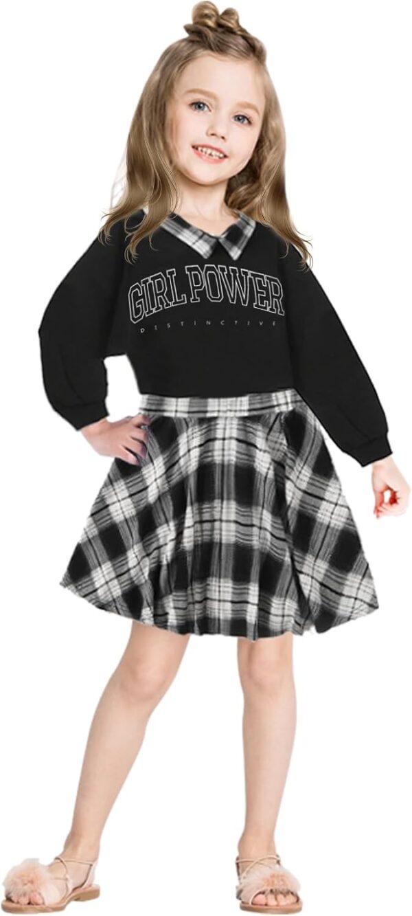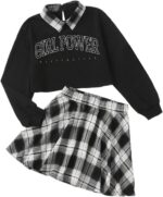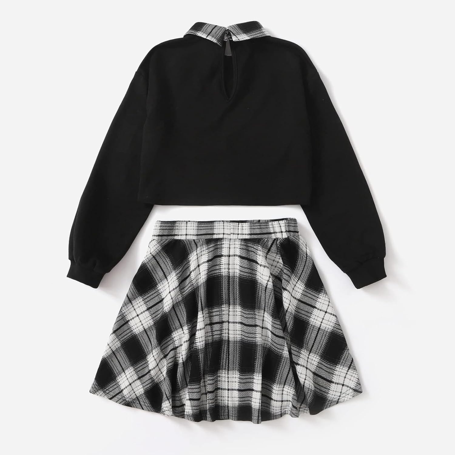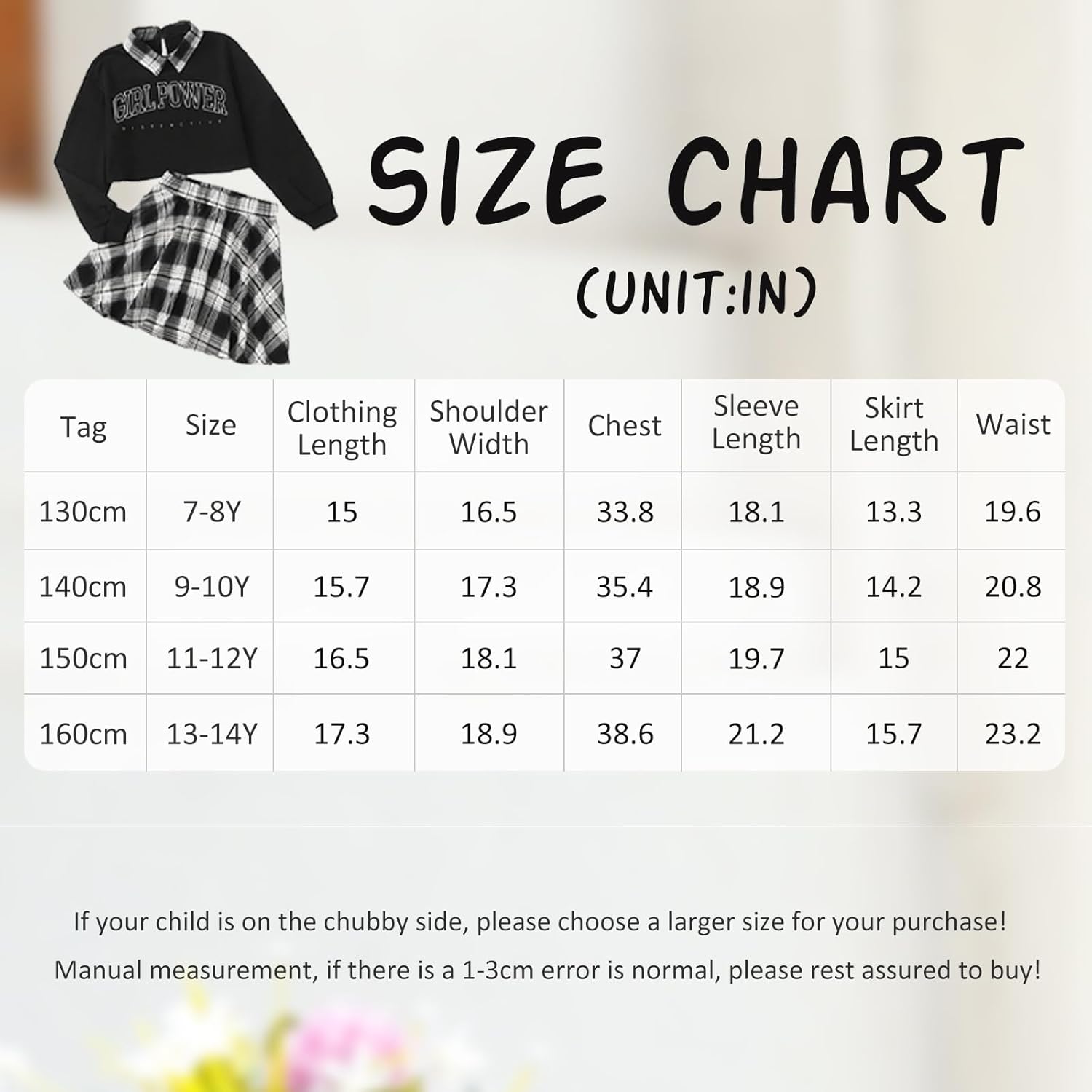 Momkonzz Girls Clothes Kids Outfits Plaid Skirt Set Letter Printed Crop Pullover Polo Top 7-14 Years