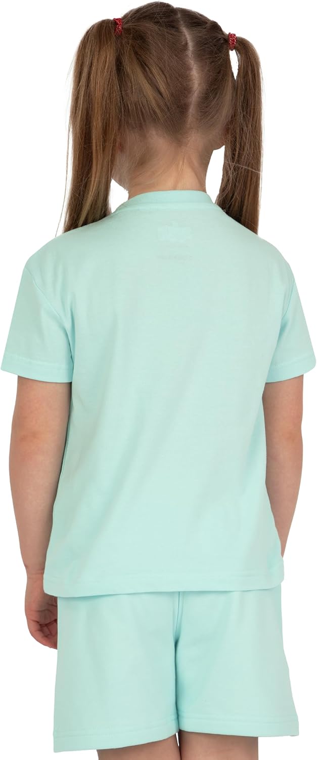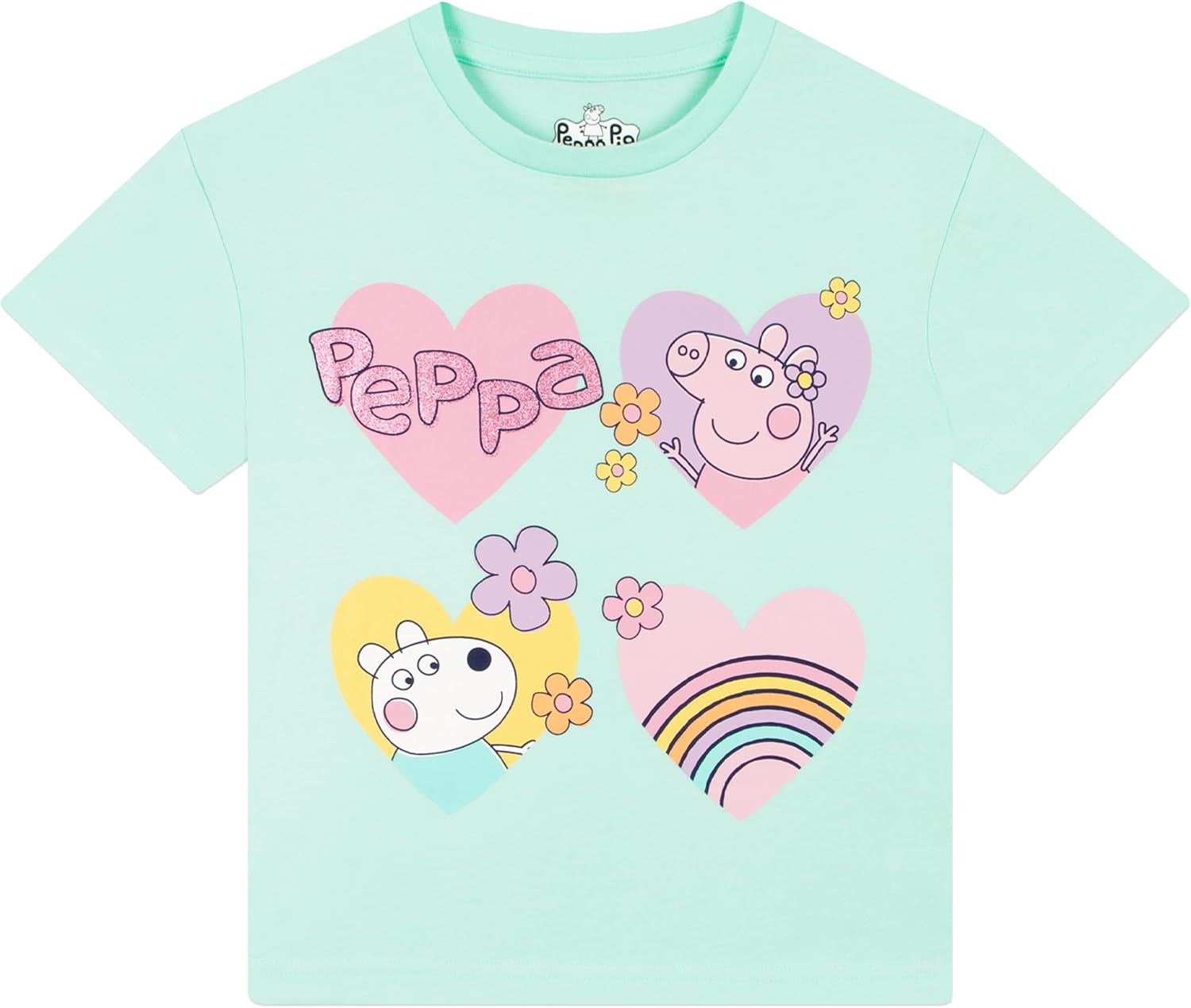Sprinkle a little Peppa Pig magic into your ones day with this enchanting Peppa Pig t-shirt and shorts set! This beautifully designed duo is the perfect blend of fun and functionality, ideal for fans of the beloved Peppa and her playful adventures. The short sleeve girls tshirt, in a vibrant shade of blue, features a unique heart-themed design that captures the essence of Peppa and her friend Suzie Sheep. Two of the hearts contain illustrations of the friends, while the others showcase a lovely rainbow and the word ‘Peppa’ in sparkling pink glitter, all encircled by a flurry of cheerful flowers. This kids tshirts girls will love is sure to be a hit, bringing the playful spirit of Peppa Pig to any summer clothes for girls. The coordinating Peppa Pig shorts are just as thoughtfully designed, with an elasticated waistband and decorative tie that gives a comfortable fit for all-day play. A sweet Peppa within a heart design and the name ‘Peppa’ above it adorn one leg, adding a touch of charm to the Peppa Pig t shirt and shorts ensemble. Made from soft, breathable cotton, this girls outfit set is both durable and gentle on the skin, perfect for warm summer days or active indoor play. This official Peppa Pig merchandise is made to withstand the rigors of child’s play while maintaining its delightful appearance. Whether your little one is attending a Peppa Pig party, enjoying a family outing, or simply playing at home, this girls shorts and t shirt sets will keep them cool, comfortable, and cute. Ideal for gifts for children, this Peppa Pig outfit set will delight any young fan with its vibrant colors and fun designs. It’s more than just clothes for girls; it’s a fun and functional gift to pair with Peppa Pig toys that also celebrates imagination and joy. Making this girls clothes a thoughtful Peppa Pig tshirt and shorts for any occasion.