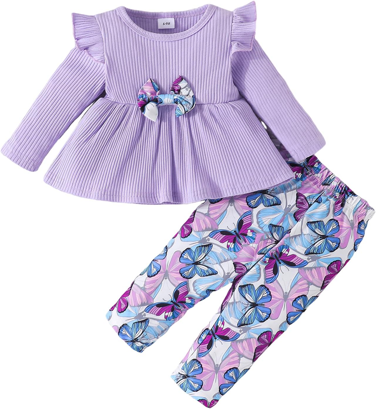 Similotey Toddler Baby Girl Clothes Ruffle Tops with Bow and Butterfly Print Pants 2Pcs Clothing Set