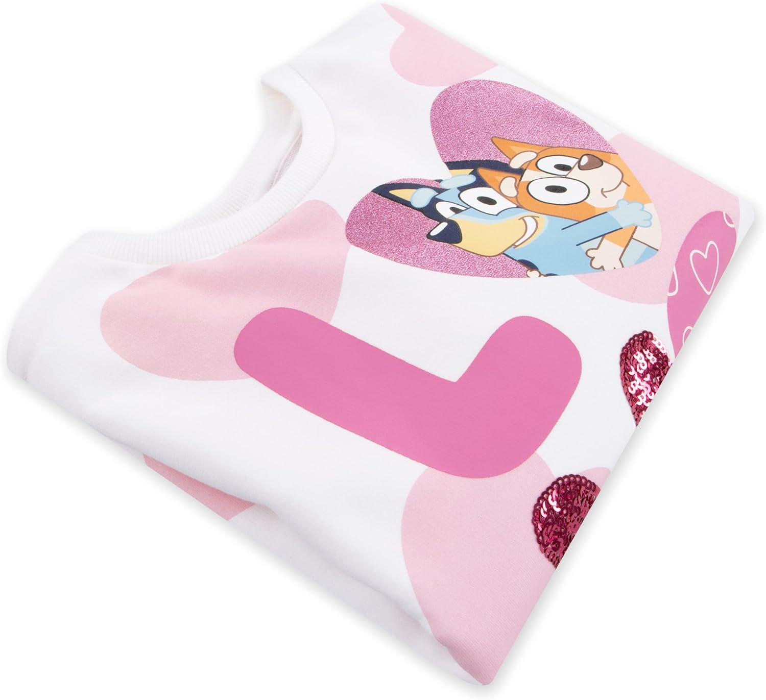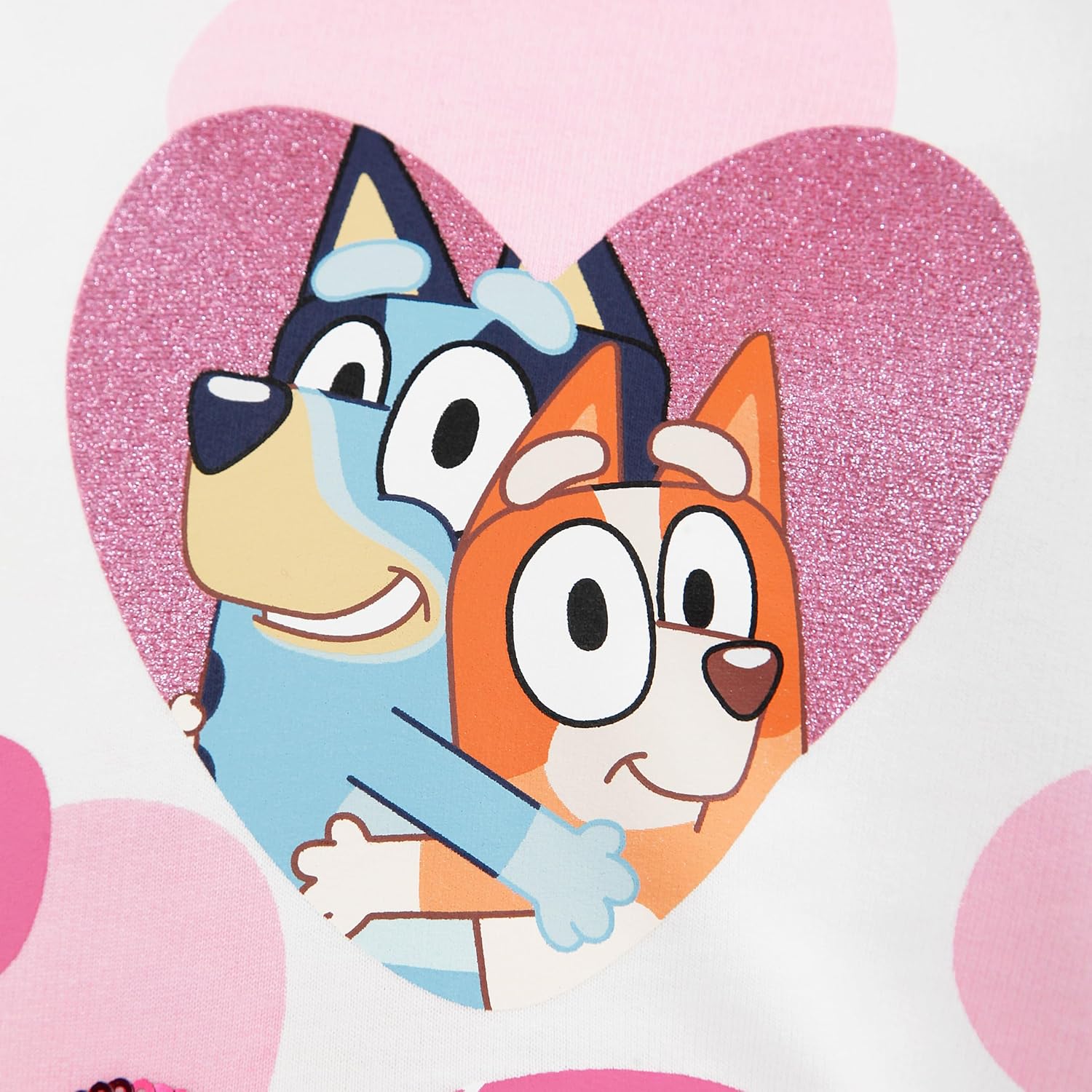 Officially licensed and exclusive Bluey jumper for girls. Style their love for the iconic Bluey characters Bluey and Bingo with this adorable Bluey sweatshirt! An off-white girls top adorned with a background of large pale pink hearts as well as one glitter heart with a print of sisters Bluey and Bingo in a heartwarming hug. This long sleeve t shirt is sure to spread the love! This charming kids sweatshirt comes complete with the cutest sequin detailing for the letter ‘V’ as part of the word ‘Love’ to bring extra sparkle to their collection of Bluey clothes. Toddler and child fans of the fun filled show Bluey will simply adore this sequin top. Fashionable and versatile sweatshirts perfect for all year round play and adventures with Bluey, Bingo and friends. The cuffed long sleeves provide the perfect fit, whilst the 100% cotton fabric of these girls’ long sleeve tops provides unbeatable comfort perfect for Spring, Summer and even Winter layering. Pair with Bluey leggings and t-shirt for the must have and most adorable Bluey outfit for girls. So, if you’re on the lookout for cute Bluey clothes or searching for Bluey gifts for a special girl in your life, look no further. Pair this Bluey top with a Bluey teddy to create the best Bluey gift for your little follower of Bluey. This Bluey sweatshirt combines style, comfort, and a whole lot of love.