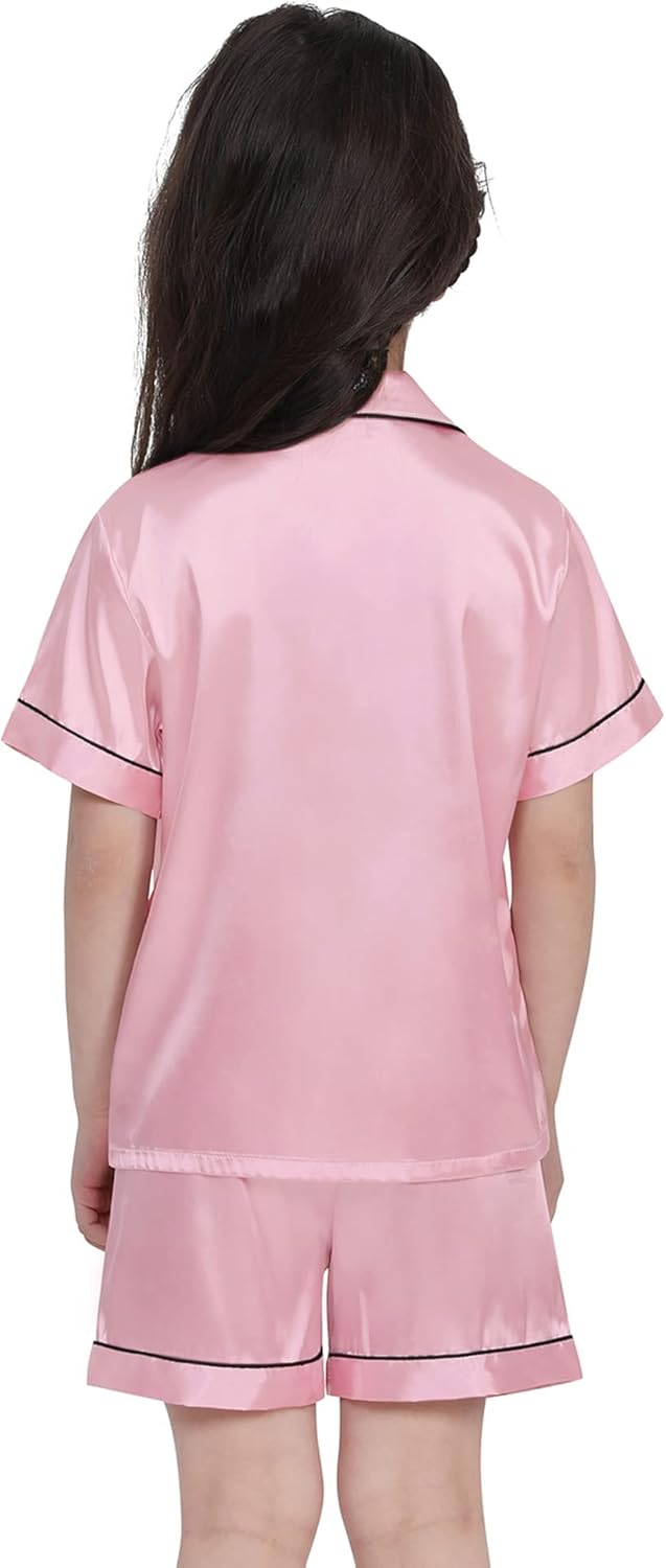 SWOMOG Kids Silk Pyjamas Girls Boys Short Sleeve Satin PJs Sets Button-Down Silky Nightwear Children Sleepwear Teens Age 4-16