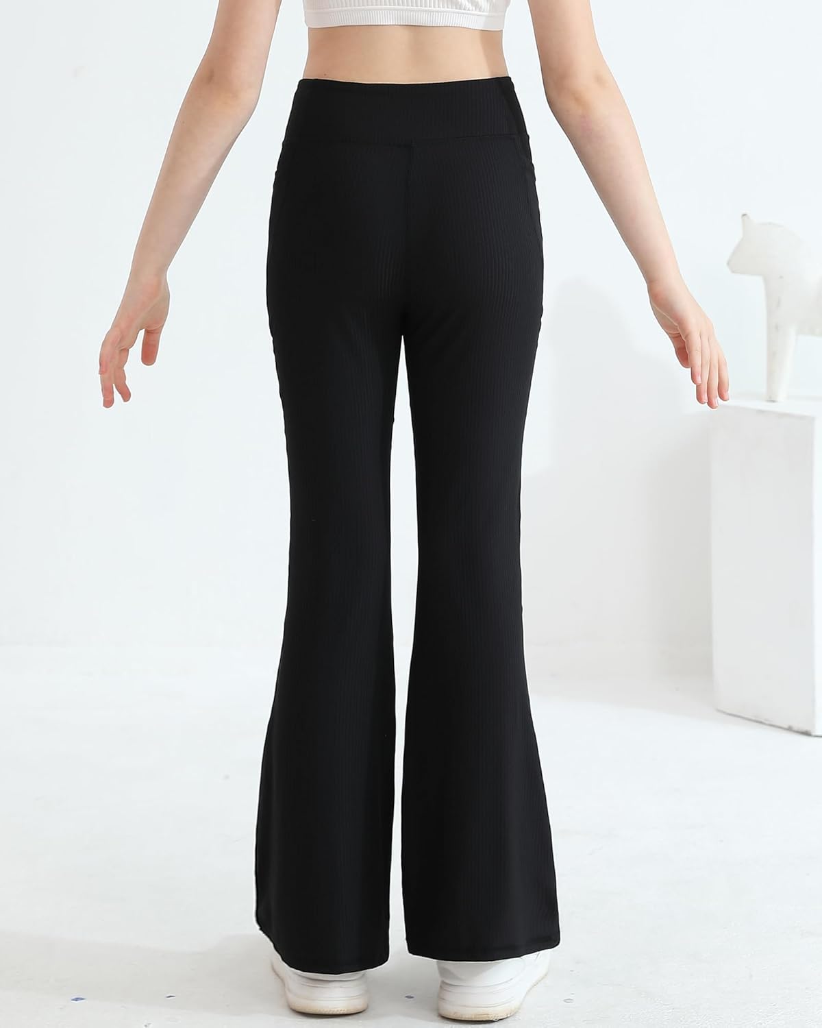 Valcatch Girls Flare Leggings Ribbed Yoga Dance Pants with Pockets High Waist Bell Bottom Trousers Kids Teens Wide Leg Pants Athletic Tights for Casual and Activewear