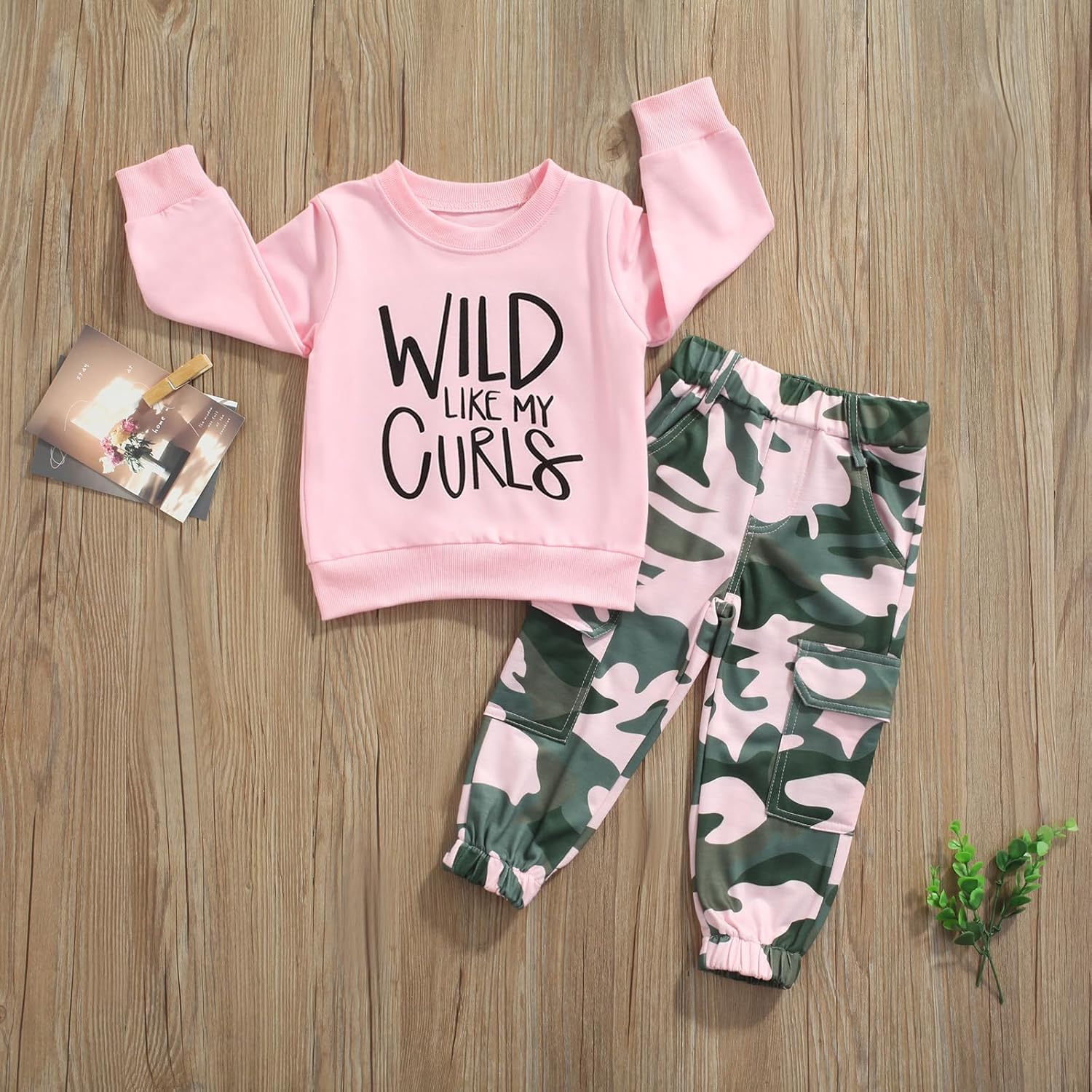 WERNZATT Toddler Girls 2 Piece Outfits Letter Print Long Sleeve Pullover Sweatshirt&Camouflage Pants Set Kids Sweatsuit