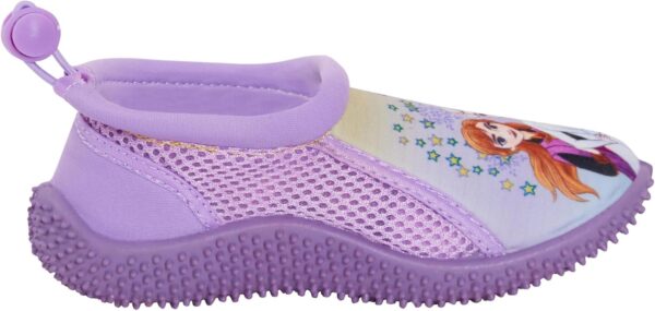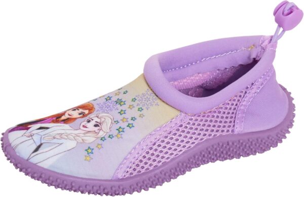 GIRLS FROZEN AQUA SOCKS Official Disney Frozen aqua socks. This design is a slip on aqua shoe in a purple colour theme. Each pair features an image of Elsa and Anna on a starry background. The waterproof fully flexible soles include gripper dots to help with grip when walking. The insoles and heels are fully cushioned and provide additional ankle support, which is extremely important in childrens footwear. The shoes feature strong but lightweight soles to provide extra grip and comfort. Perfect to wear on the beach or at the pool and they also make great gifts for all young Frozen fans.